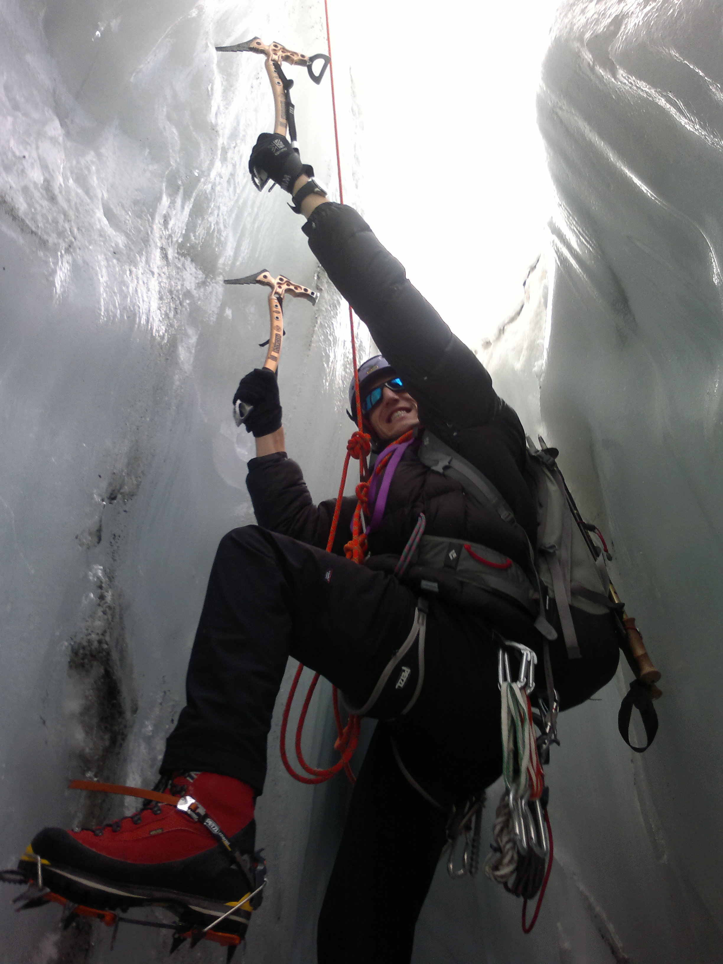 Z vremenom, organizacijo in izbiro termina izvedbe tečaja smo imeli srečo. V torek zvečer, pred samim tečajem, smo izvedli prvi del ‘suhe’ vadbe v telovadnici. V petek smo zato na ledenik prišli res pripravljeni. Ta del vadbe je bil izveden učinkovito in v celoti po planu. Prav vsi udeleženci smo izvedli osnovno izobraževanje navezovanja in hoje po ledeniku, kakor tudi najzahtevnejši del izobraževanja / manevra reševanje padlega v ledeniško razpoko.