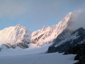 Počasi se naredi dan, takrat te malo zazebe, ali pa ti čelna svetilka kar zamrzne. Ko pot preide na plato ledenika zasije sonce in se pogled odpre nad dolino in na vrh. Še sanjamo o vzponu do križa na 3.798 m.