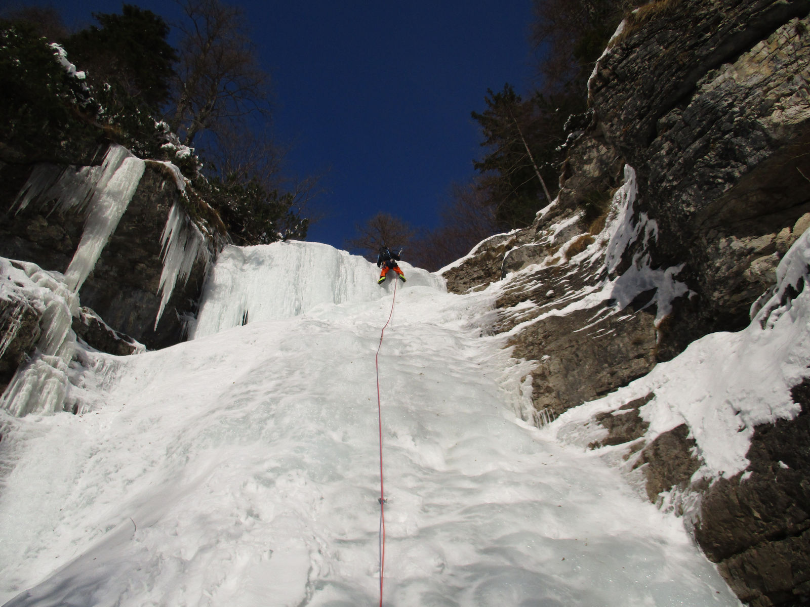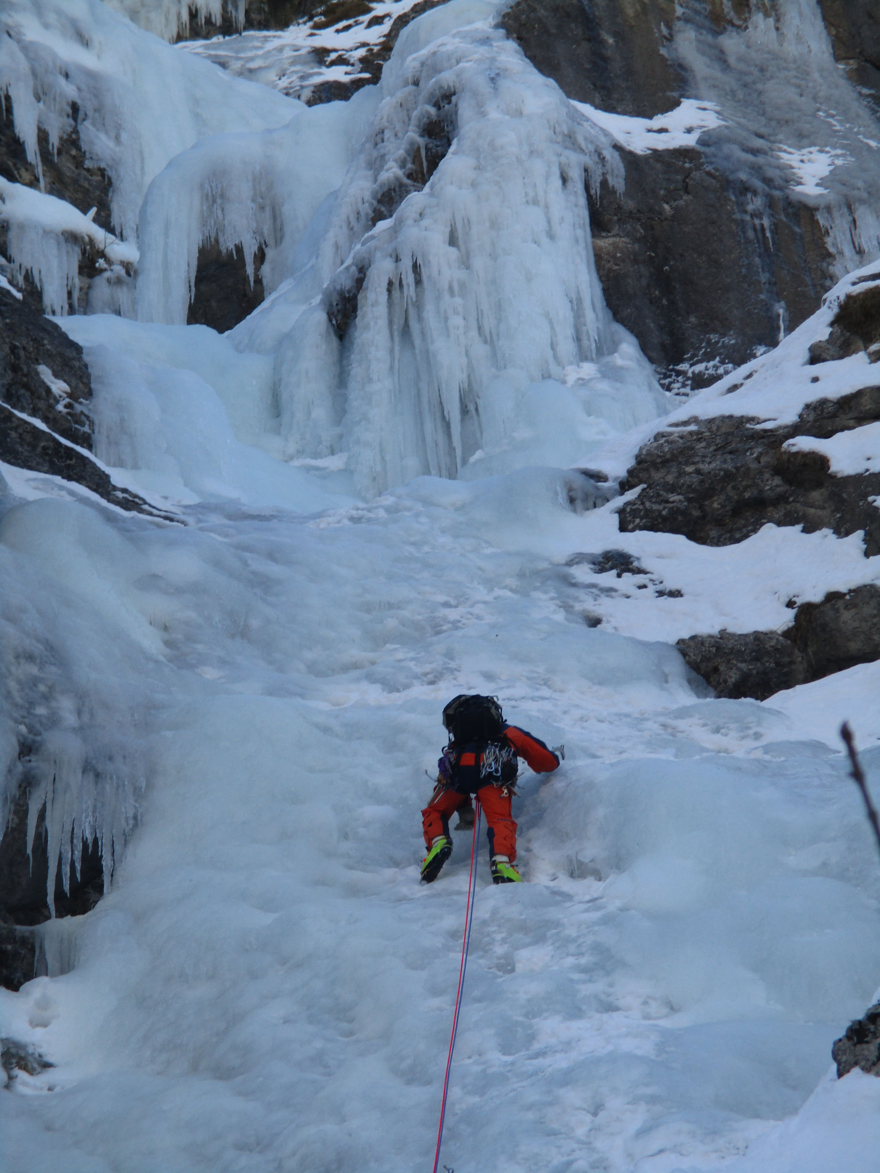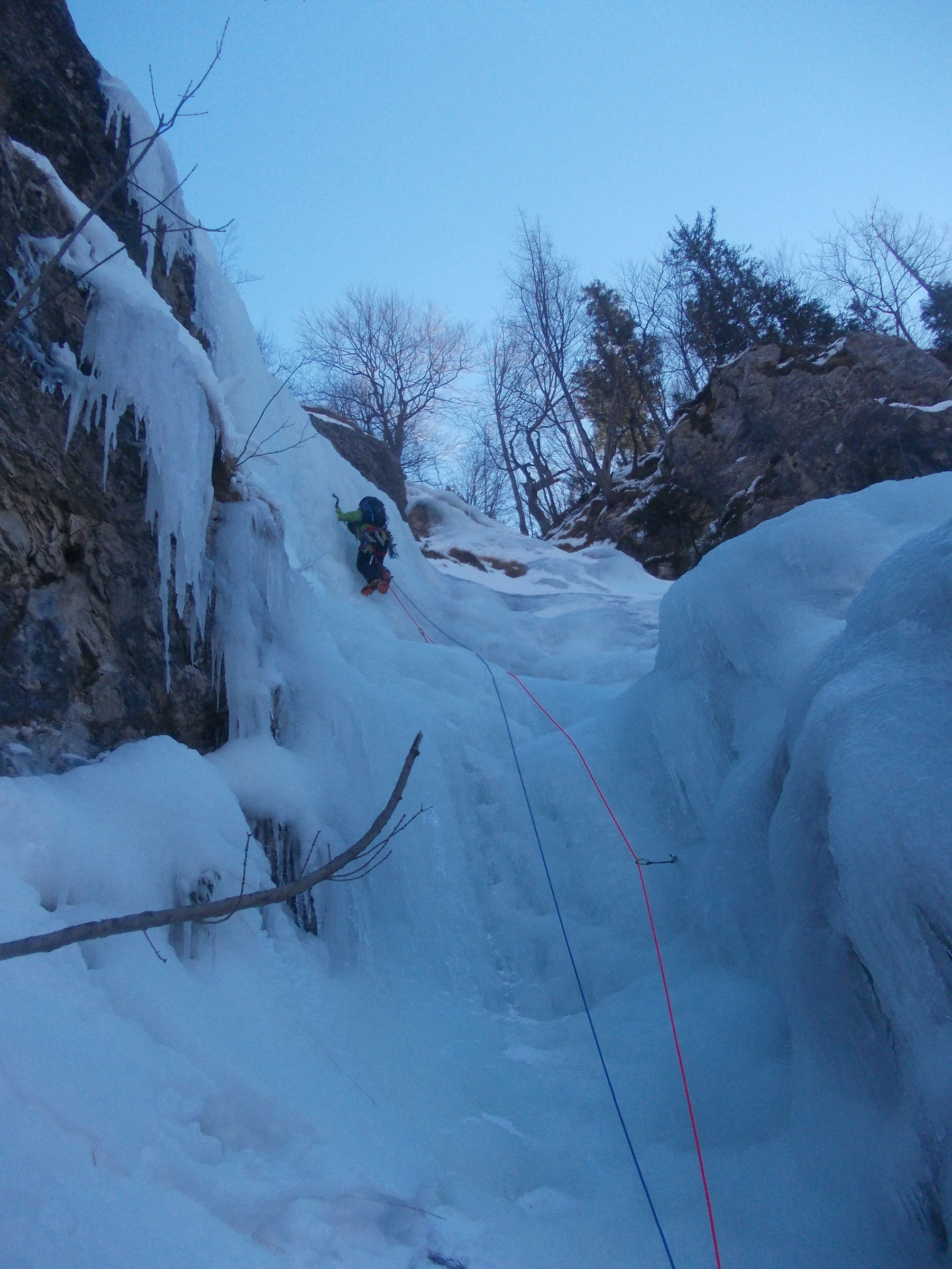 Včeraj sva z Tončkom preplezala slap Fortino (Bunker) ob Rabeljskem jezeru. Sestavljen je iz dveh delov, spodnji se nahaja direkt za bunkerjem, do zgornjih raztežajev pa je treba še kar nekaj časa hoditi po enem grabnu s parimi skoki, nato se postavi kar pokonci . Zanimiv slap oziroma grapa, lažje težavnosti. Led je bil vrhunski, le v enem prehodu sem se spraševal, kako nama s Tončkom uspe še v ledu plezati podrte trojke:)