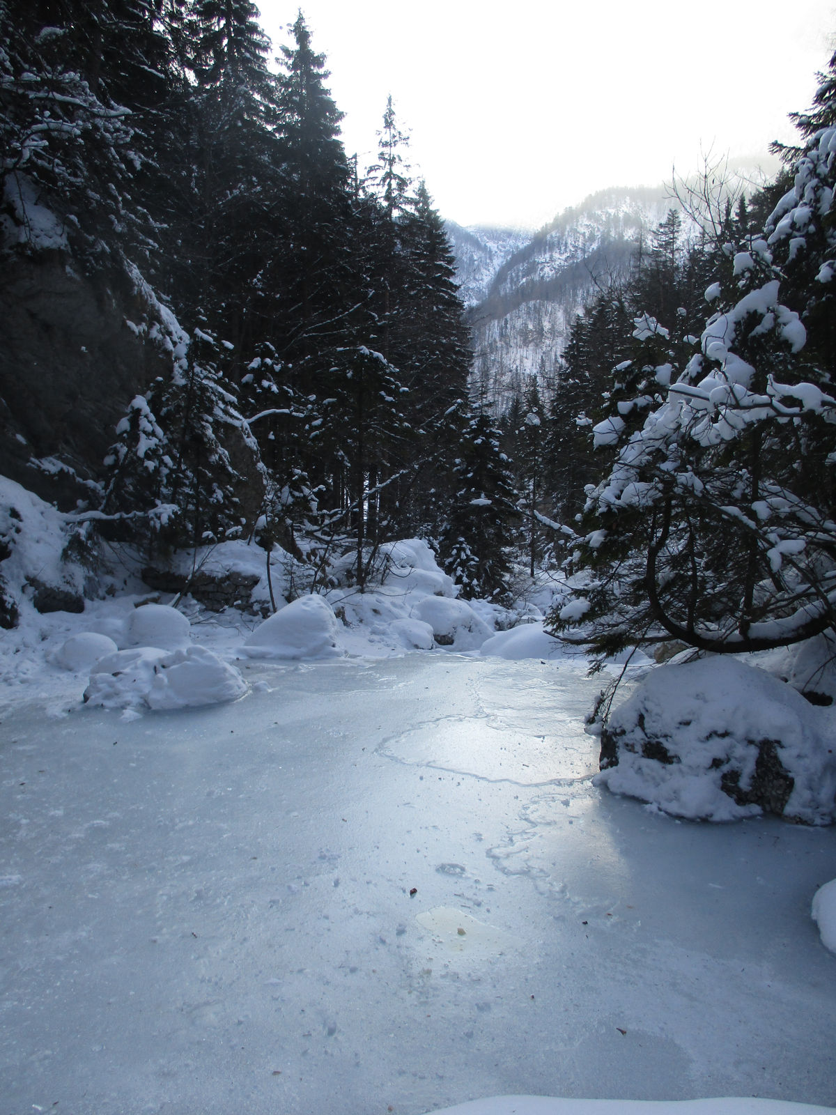Zadnji cug sva izpustila. Že tako slab led je bil ob znatnem plusu na termometru in vodo, ki je žuborela na vse strani precej nevabljiv, zato sva ga pustila za drugič. Vseeno sva se dobro naplezala in mirne vesti oddrvela nasproti novoletnemu rajanju.