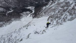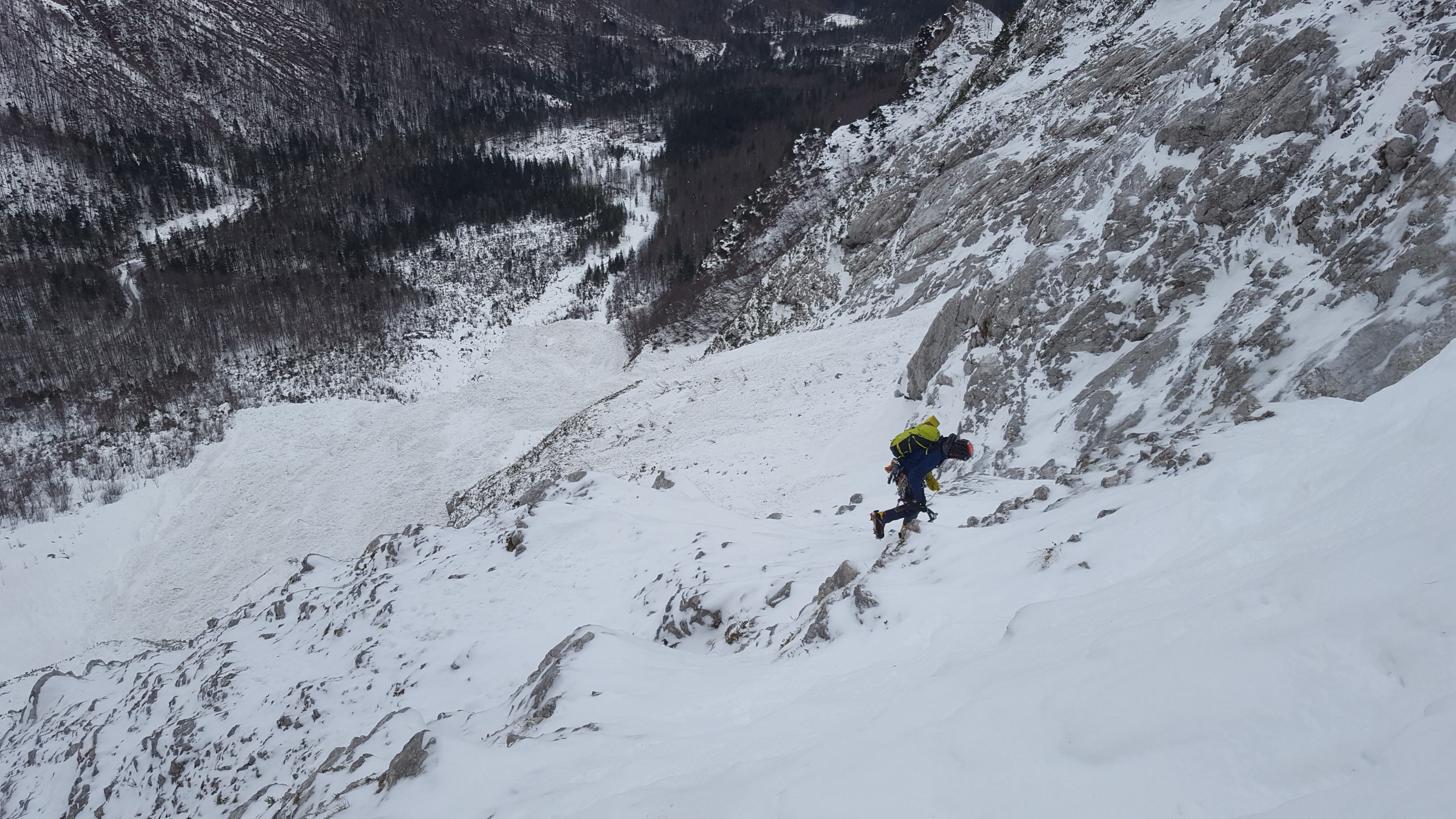 V zgornjem delu sva nenavezana plezala odličen škripavček do 75° . Z višino se kvaliteta snega slabša, več je tudi klož in napihanega snega. Čez sumljivo pobočje, sva se spustila po vrvi.