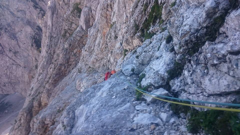 Pozno vstajanje in še poznejši vstop kompenzirava z dirko do Dibonove police, pod njo se naveževa, potegneva par cugov do konca štrika in še malo čez … in že sva pod glavno zajedo, kjer ujameva zabavno navezo iz Matice (hvala za piškote!) ter oddrviva proti vrhu. Tam naju že čaka Brvar, ki je ta dan lezel Direttissimo. Včasih je igra naklučij res neverjetna. Pred dvemi leti smo se prav tako srečali v Špiku, le da sva takrat z Menotom lezla Direttissimo, Grega in Samo pa Direktno.
