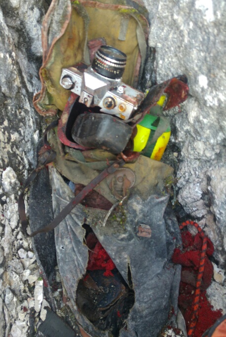 Od Dibonove police do vršnega, lažjega dela nisva našla sledi predhodnikov, sva pa pod prvim kočljivim raztežajem, kmalu nad polico, našla star in poln ruzak, v njem pa poleg oblačil tudi muzejski fotoaparat, zemljo v vrečki (nekdaj verjetno malica), ključe od stanovanja, orglice, PZS knjižico iz leta 1974… Najverjetneje je šlo za ponesrečen poizkus prvenstvene smeri ali pa zgrešeno ponovitev, ki se je zaključila v krušljivih platah nad polico. Tudi sam priznam, da ob slabi skali, že dolgo časa nisem lezel cuga (ali dveh) s tako posranmi gatami kot v soboto.