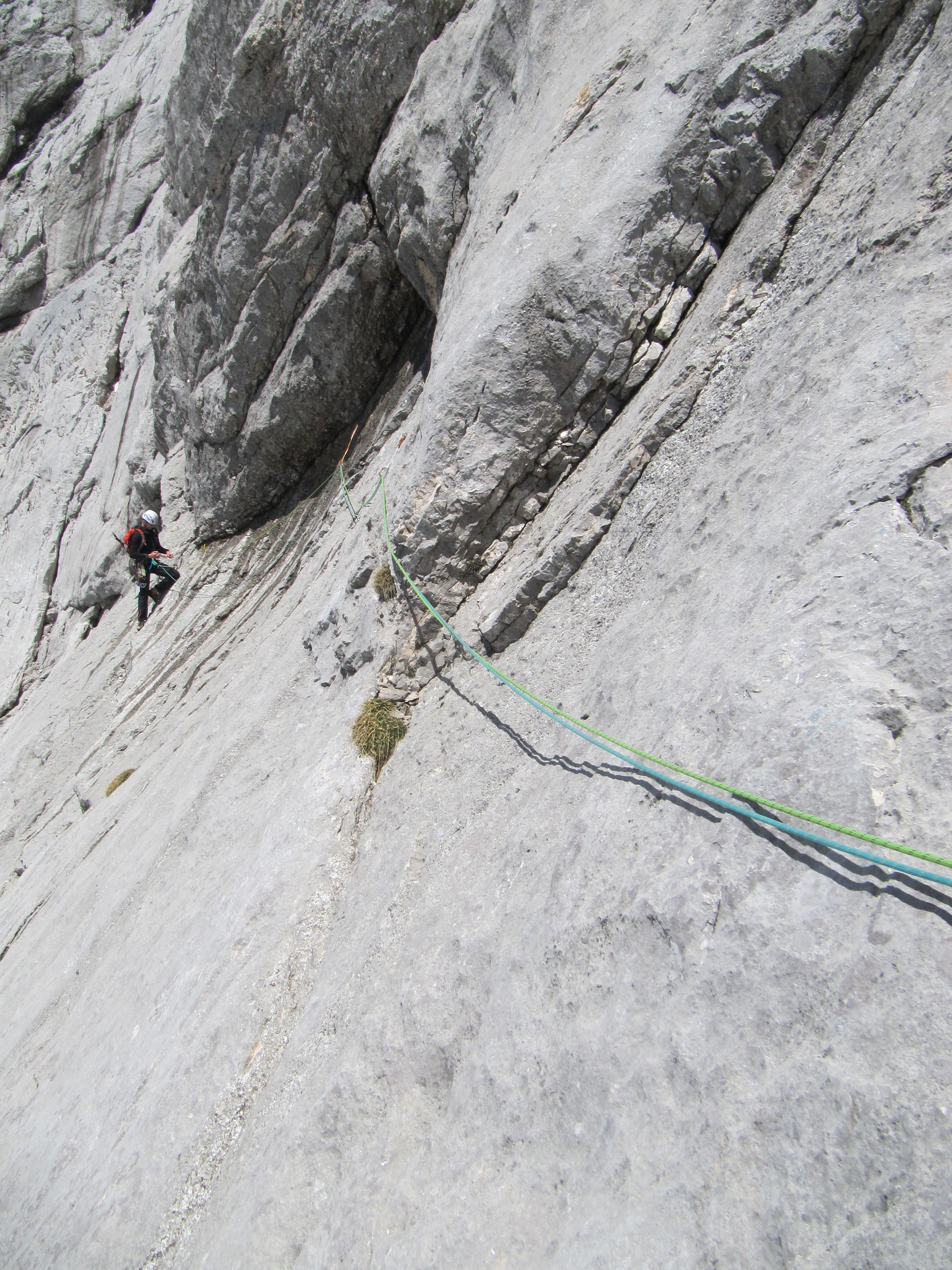 Detajlu sledi eden lepših cugov: dolg, konstanten, uživaški cug v čvrsti skali. Težave se kmalu nehajo in po lažjem terenu naj bi izplezala na sedlce med Stolpom in Skuto. V tej grapi je še precej snega, zato sva se odločila, da se drživa desne in preko vrha Skute sestopiva na Pode. Na greben sva izplezala v območju smeri Polmesec. Sestopala sva v megli. Primerno opremljena sva vsaj 200 višinskih metrov štamfala po snegu. Povezan jezik snega se vleče od melišča navzgor skoraj čez vse zajle. Še nekaj časa bo trajalo, preden bo pot primerna za planince.