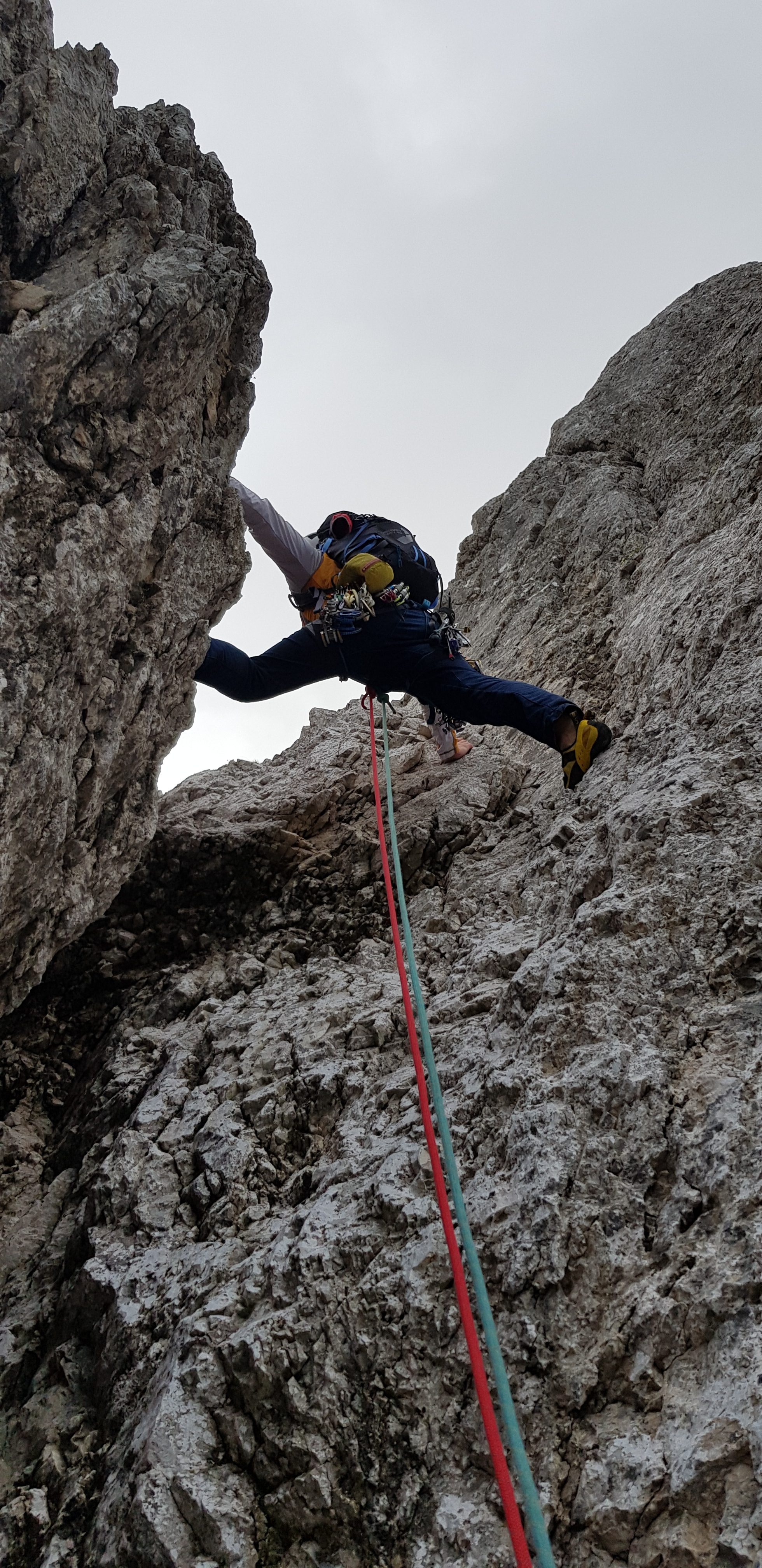 Skala je drugače večinoma dobra, le v zgornjem delu je precej krušljiva. Tudi klinov je bilo več kot smo jih pričakovali, temu pa smo dodali še okoli šest svojih.