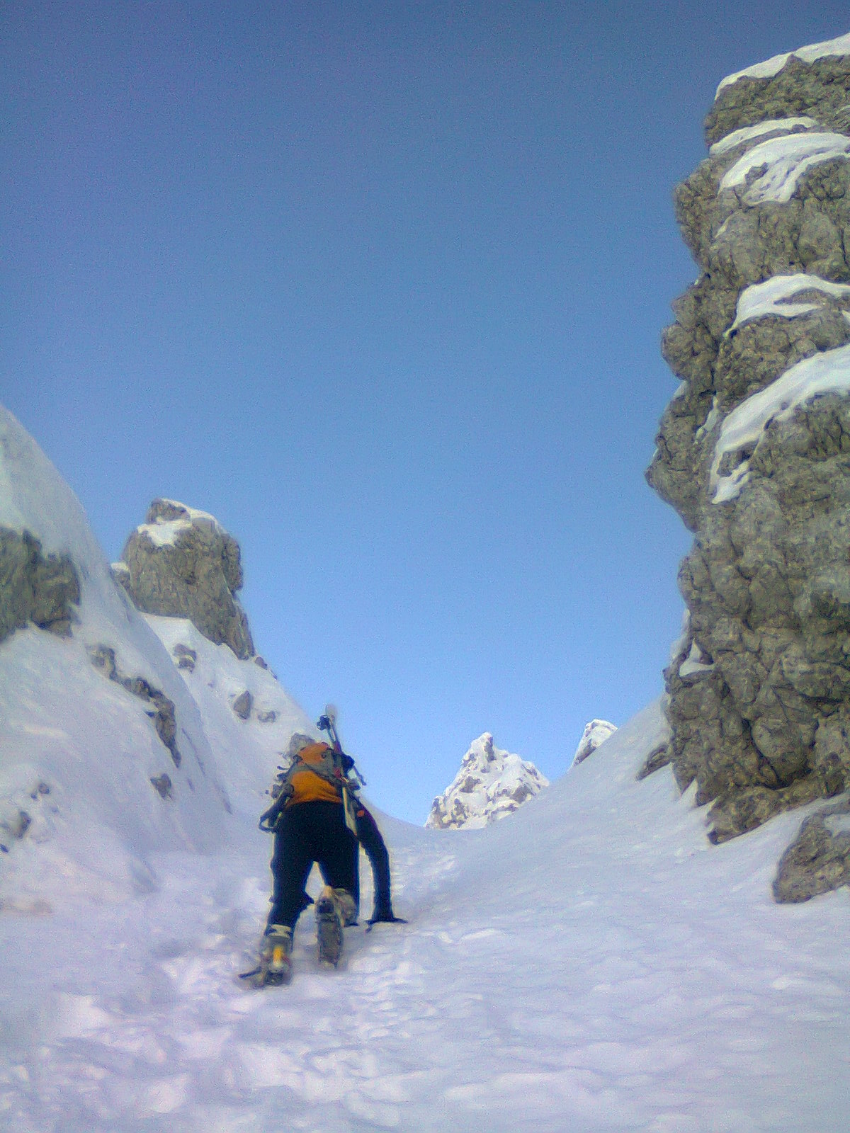 Vremenu primerno je v Zelenici naroda več, kot na Šmarni na tahmašno nedeljo, ampak v Y ni gneče. Nad grapo je velika opast, ki čaka na prevoz v dolino, zato previdno. Na vrhu natakneva dilce in po Šentancu smuk v dolino.