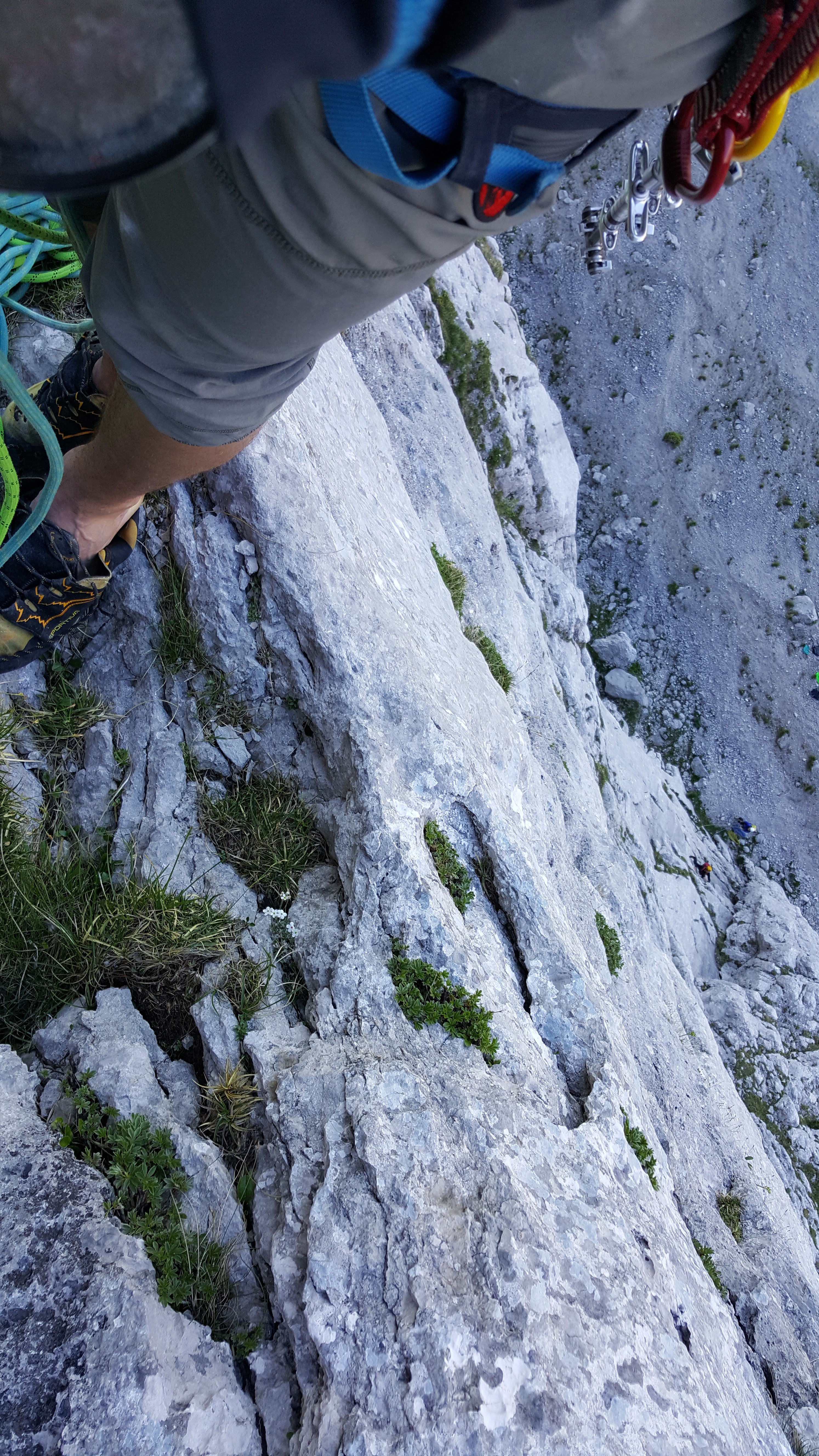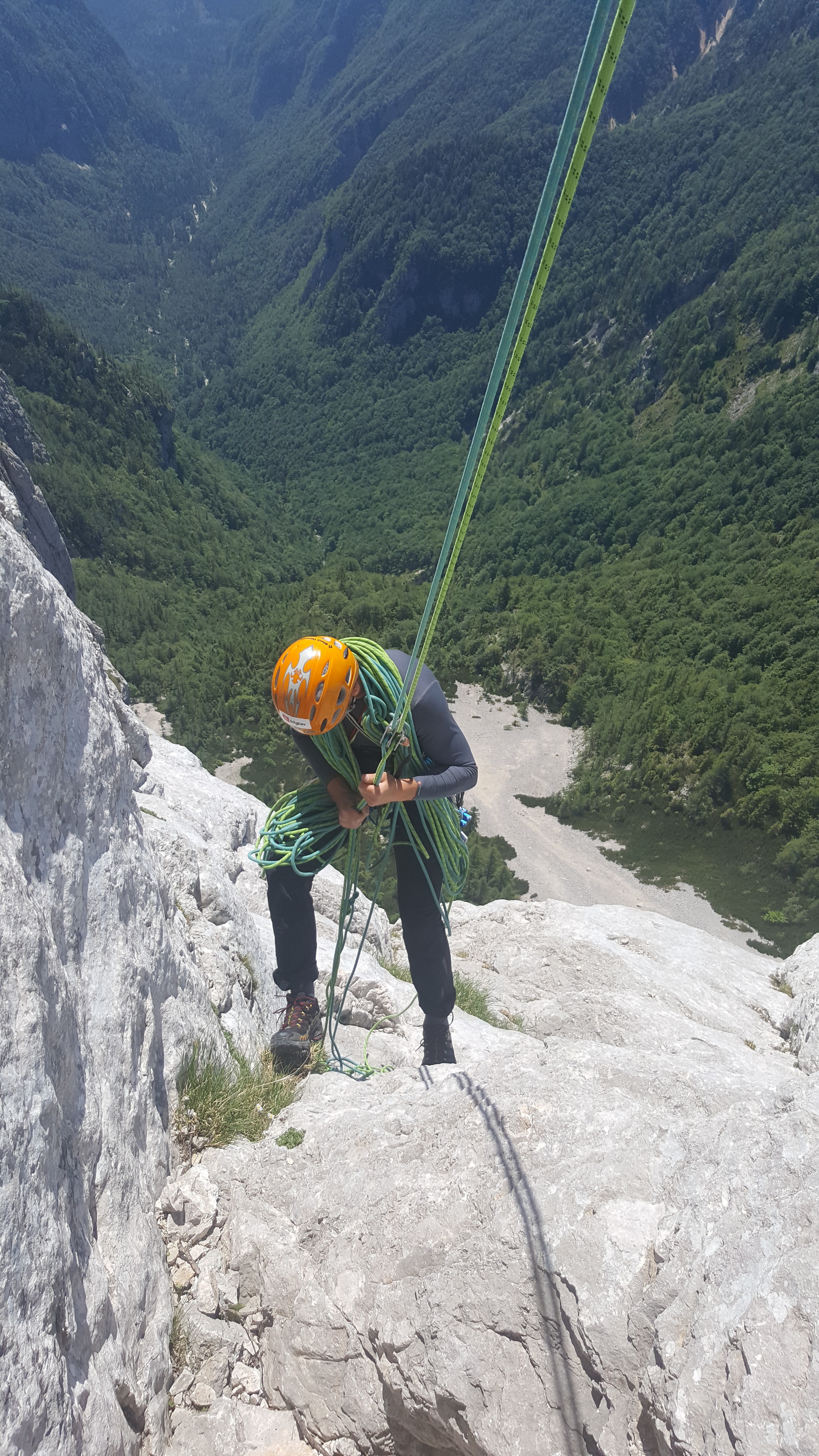 Smer GG poteka po lepih naravnih prehodih, izpostavljenost in odlična skala naredita smer bombonček. Vzpon je potekal gladko, razen enega manjšega zajeba, kjer sva se lotila napačne prečnice. Zaradi močnega sonca sva se odločila, da izpustiva epsko grmovje na vrhu in se spustiva pod steno. Seveda se nama je pri predzadnjem spustu zataknila vrv in to v edinem delu kjer sva spustila za 60m. Tedi je pripravil vse za vzpenjanje  po vrvi in čez kakšno urco sva se že spuščala dalje.