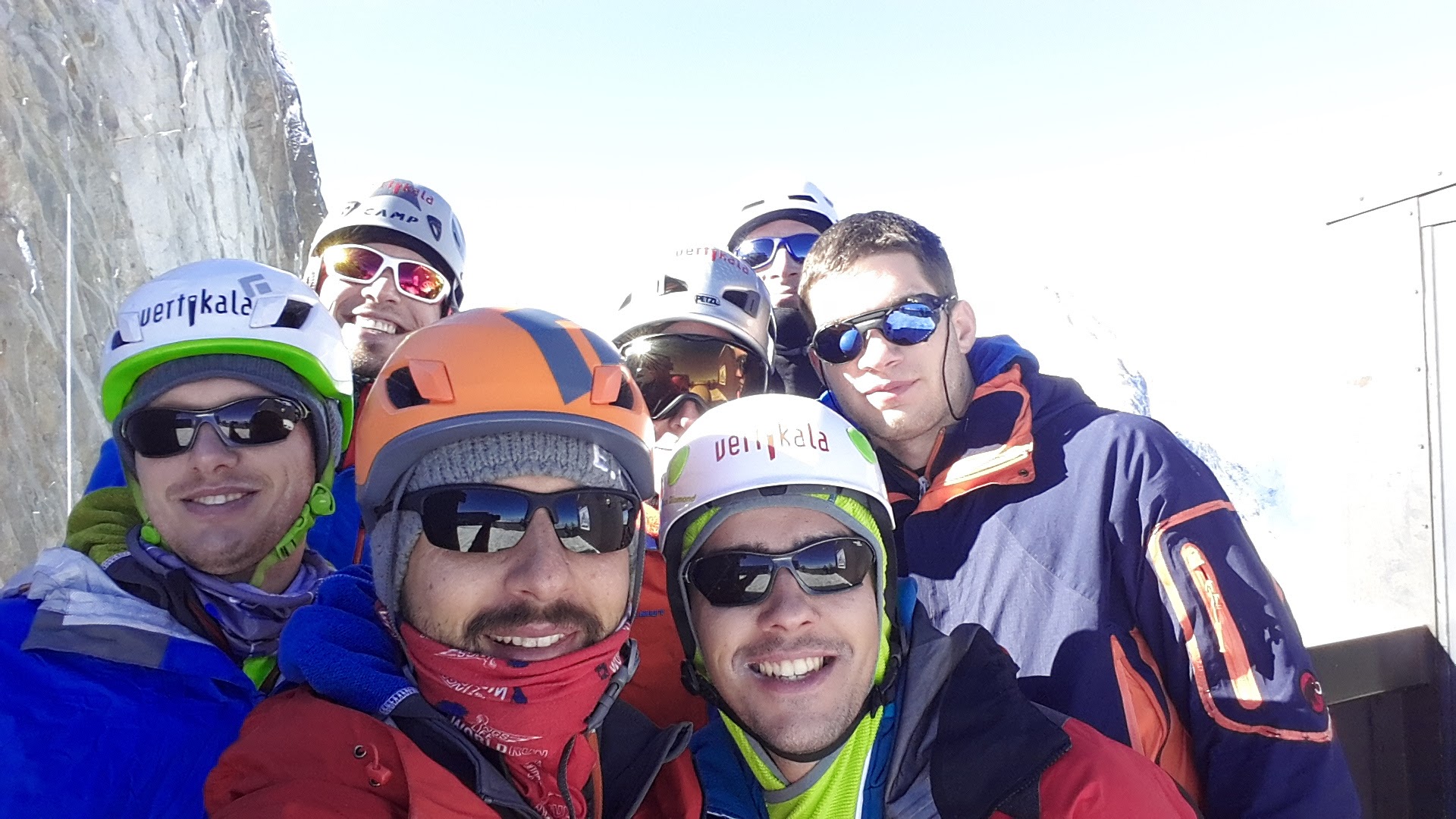 Dovolj turizma! Nadeli smo si čelade, dereze in v roke prijeli cepine, ter se po ozkem zasneženem grebenu spustili na 200 m nižjeležeči ledeniški plato Glacier du Tacul. Tam smo videli marsikaterega gorskega vodnika, kako na štriku sprehaja svojo stranko.