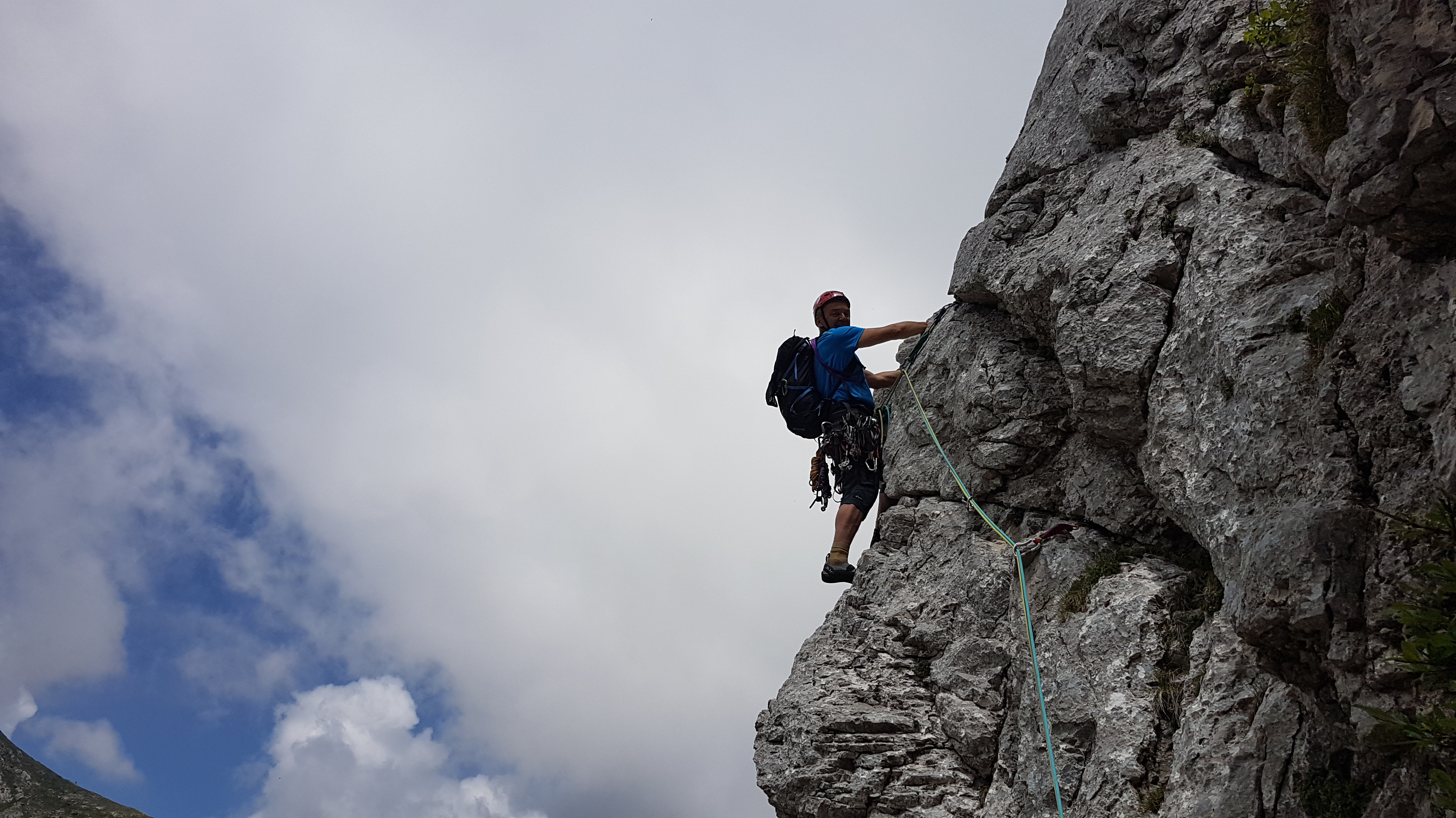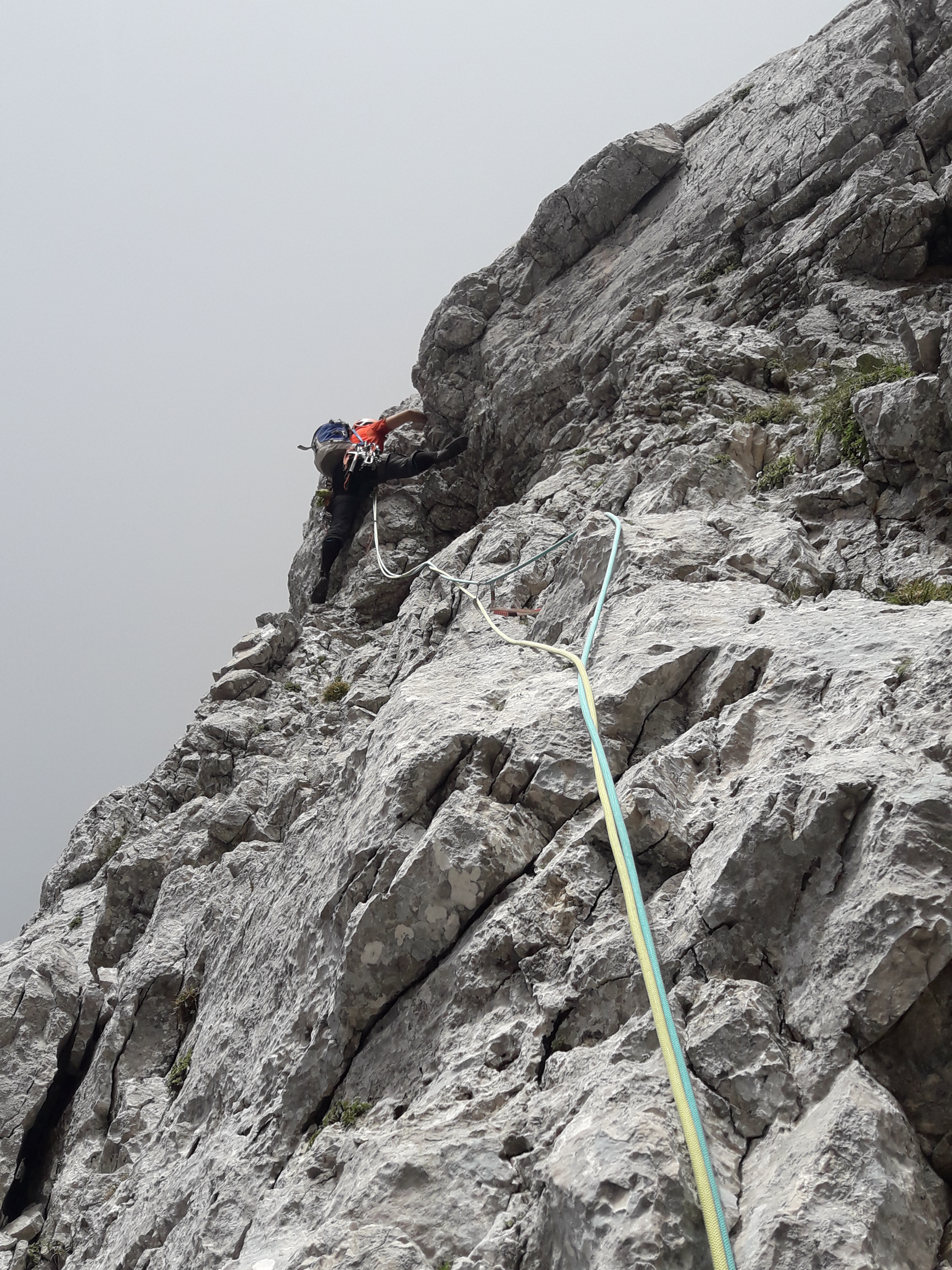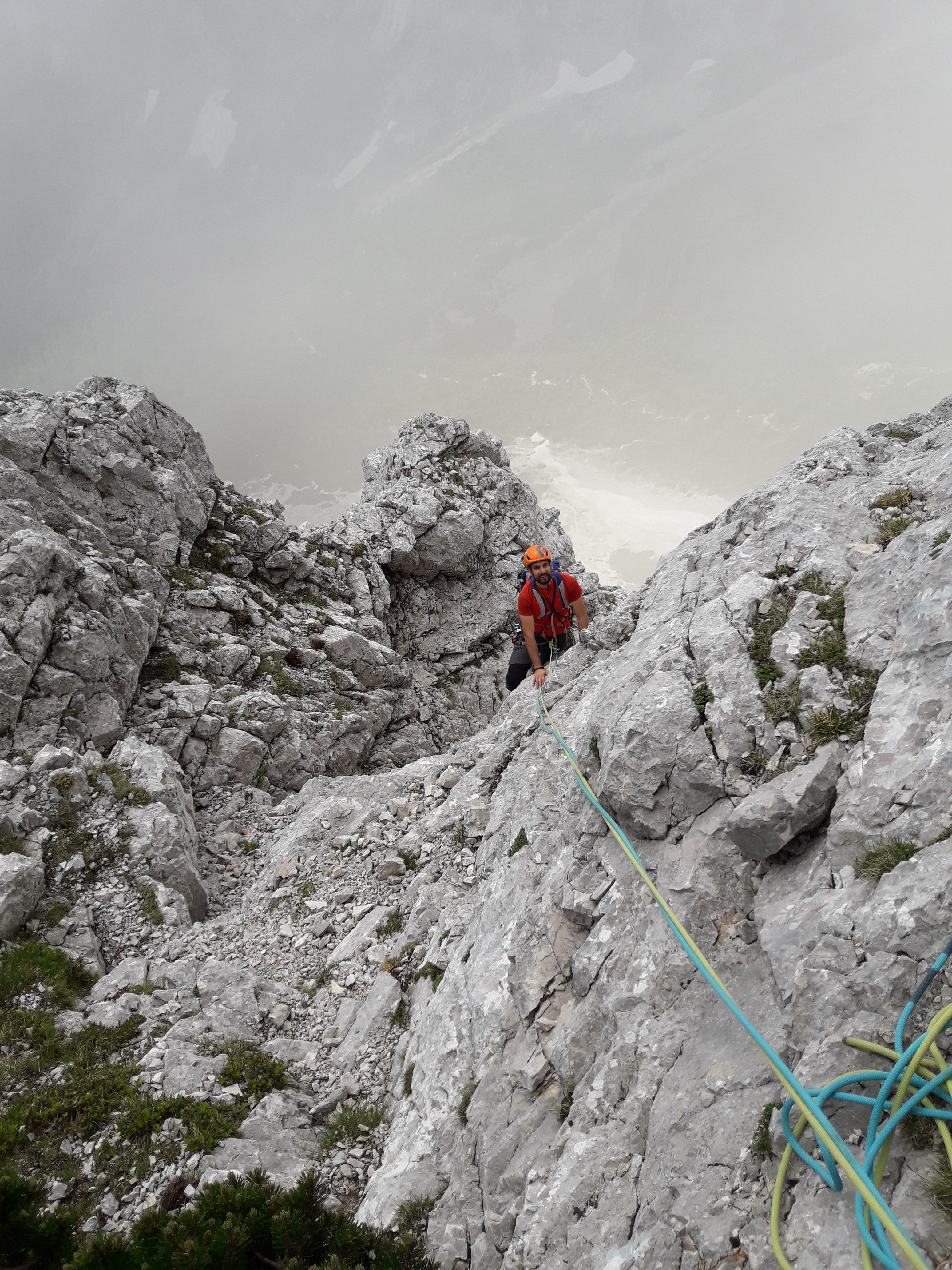 Skala je zaradi senčne lege in padavin prejšnjih dni bila nekoliko mokra. Prečenje čez travnate predele pa je tudi pomagalo, da sva imela mokre plezalne čevlje.