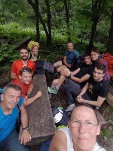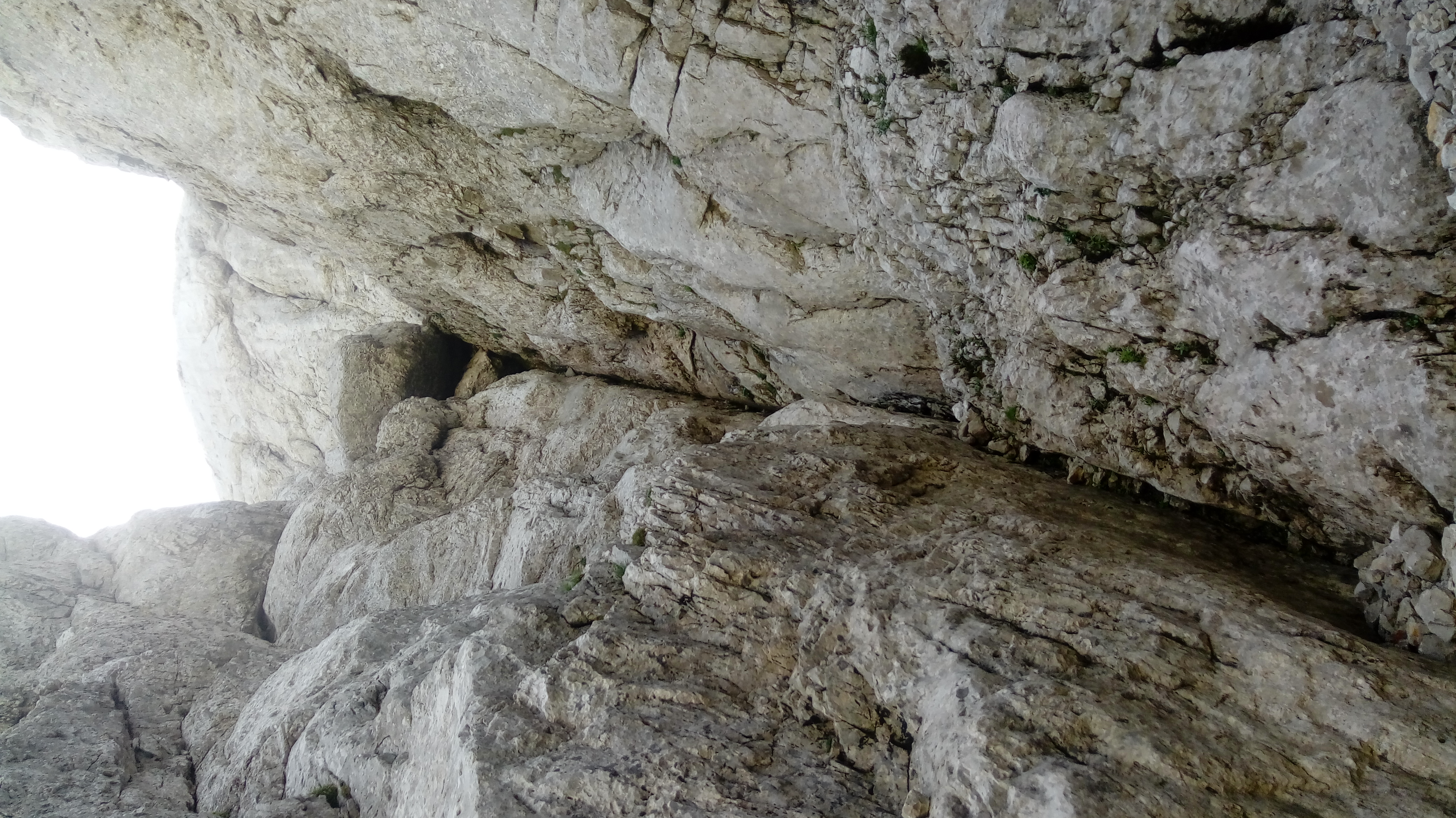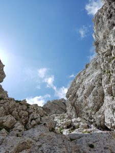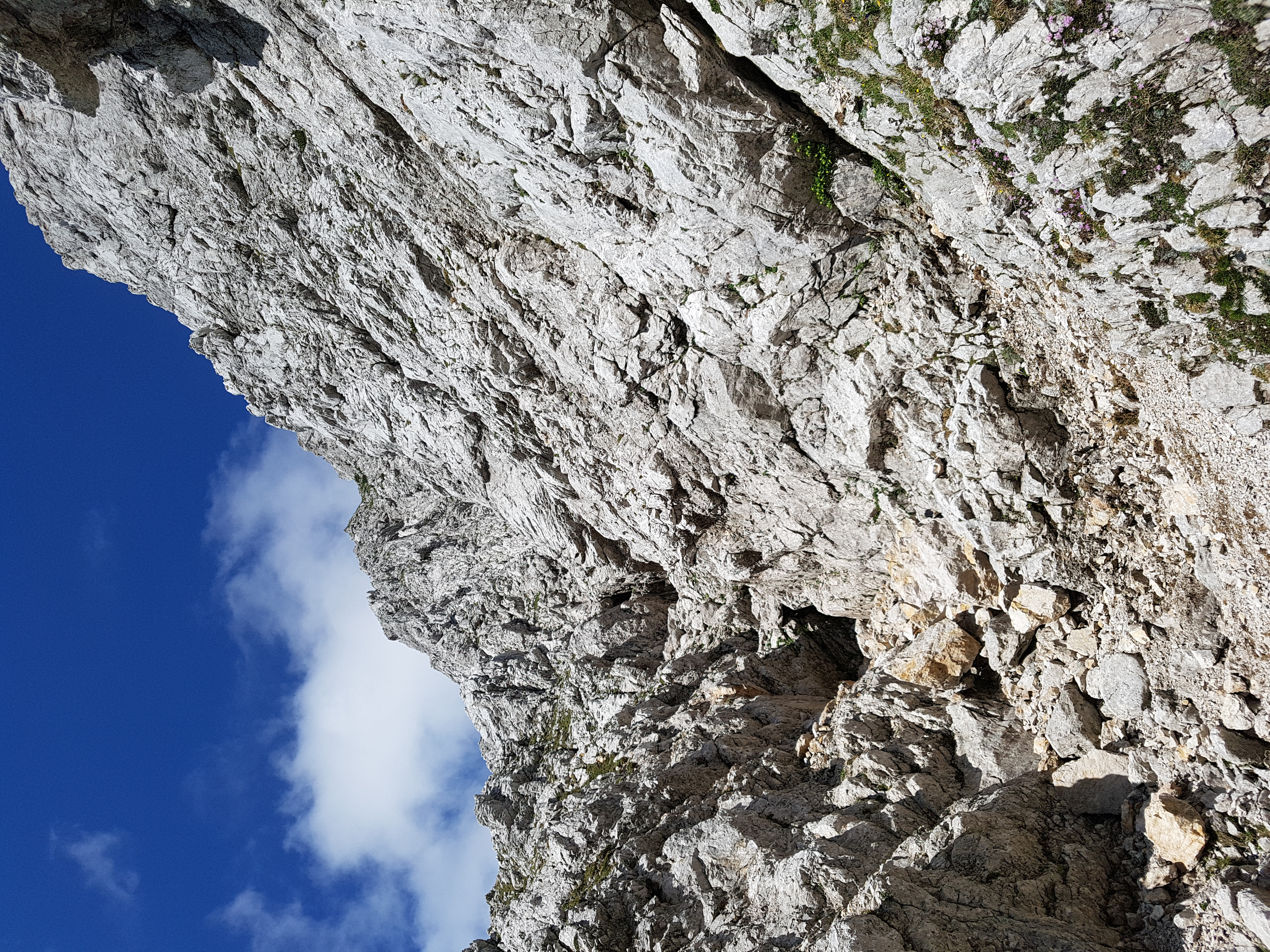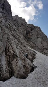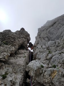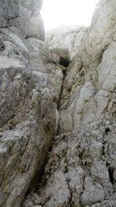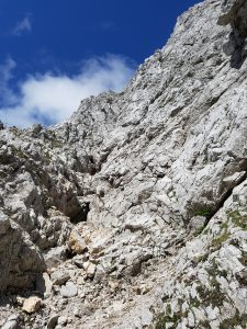 Skala je zaradi senčne lege in padavin prejšnjih dni bila nekoliko mokra. Prečenje čez travnate predele pa je tudi pomagalo, da sva imela mokre plezalne čevlje.