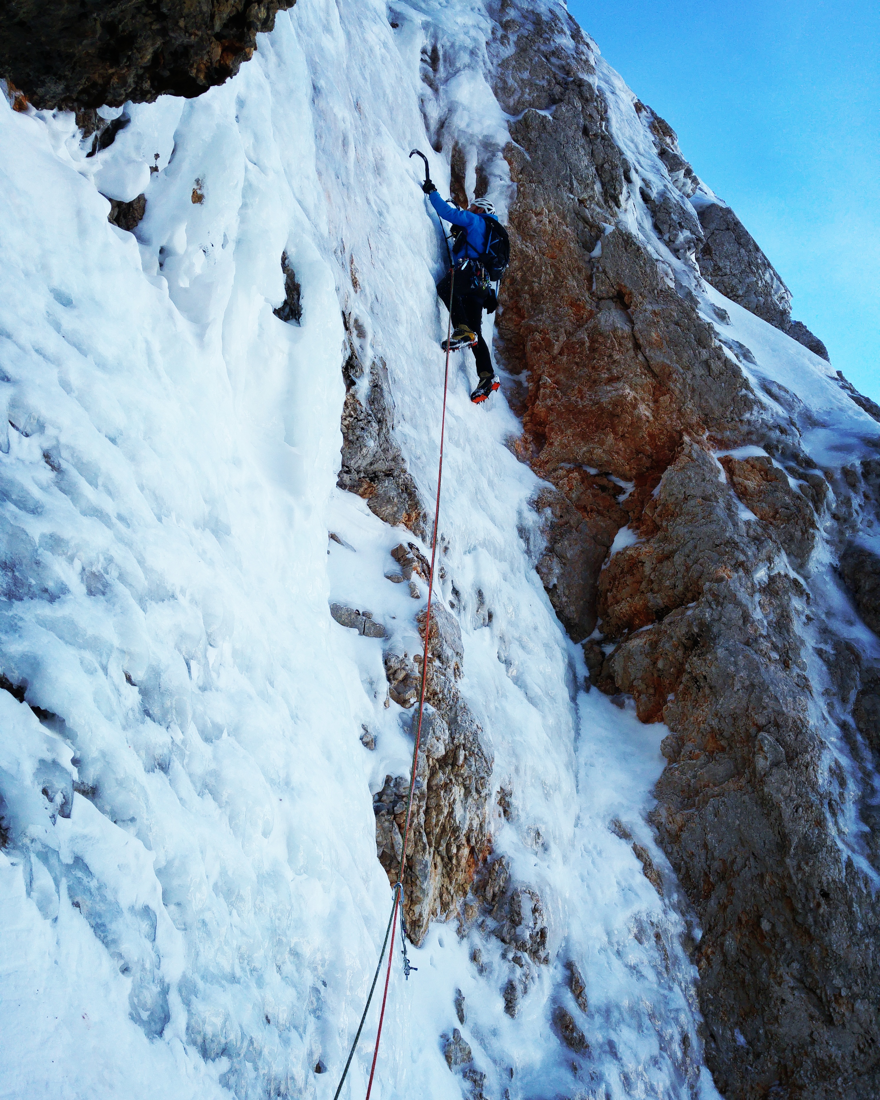 V soboto smo s Tedijem in Samotom plezali v Škrlatici. Dolg dostop in še daljši sestop je bil poplačan z odličnim plezalnim dnem v steni. Vstopili smo v Kugyjevo smer, po cca. 200m, ko originalna smer zavije desno na prostrana, položna snežišča, pa po sledeh predhodnikov, nadaljevali naravnost navzgor, kjer nas je čakal navpičen slap s precej tankim ledom. Razmere so še vedno izjemne, po skali skorajda ni bilo potrebno praskati. Isto smer je ta dan plezala tudi naveza iz Tržiča, s katero smo v Vratih skupaj poklicali Koflerjev pick-up, ki nas je zapeljal nazaj do 3. ovinka. Vzpon smo kasneje, kot se to spodibi, proslavili pri Aljažu. Bil je to še en izjemen dan v hribih!