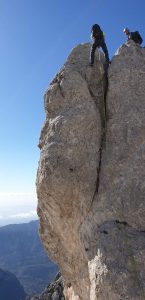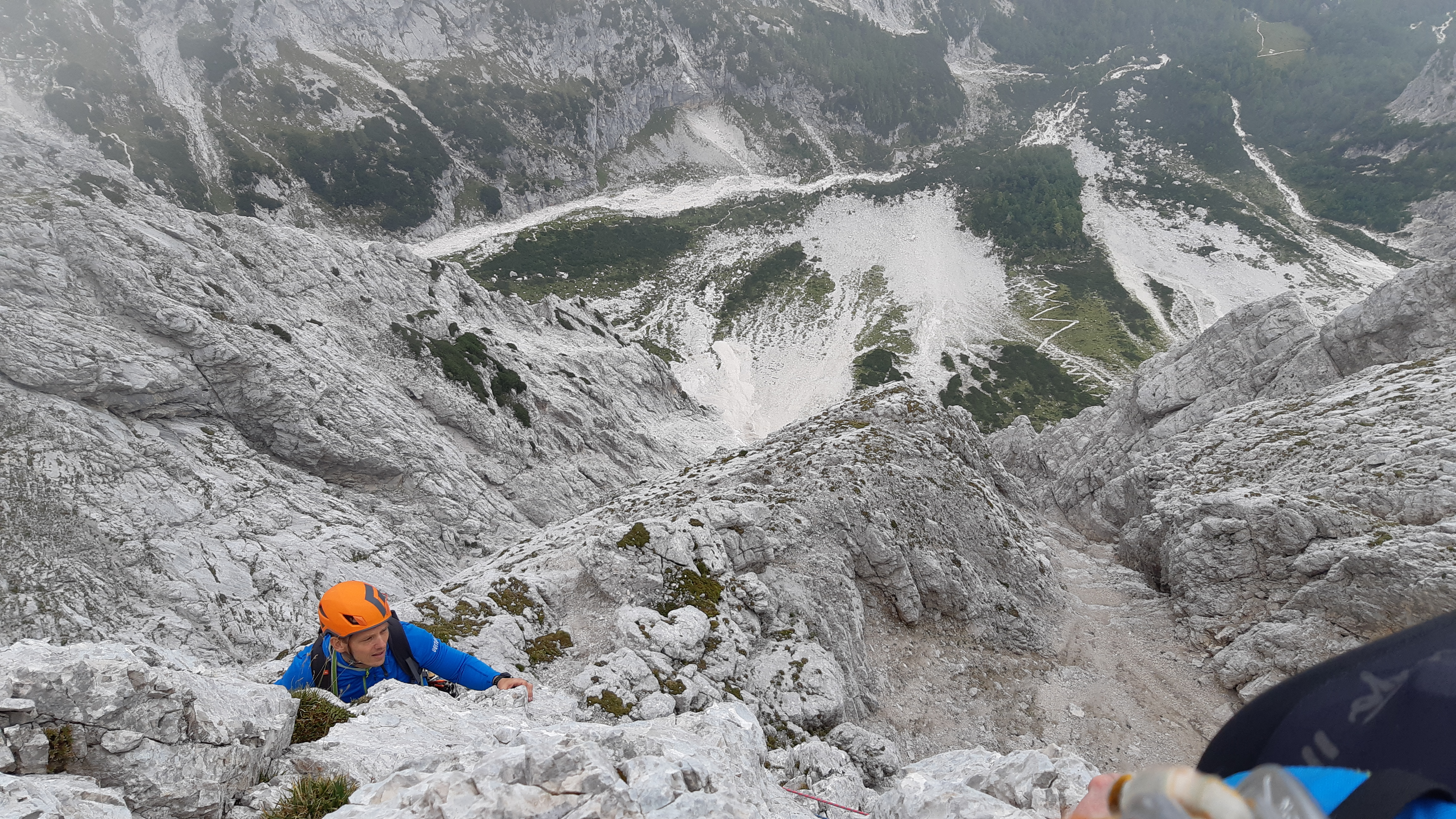 Celotno prečenje smo se strogo držali grebena in nismo delali obvozov. Eden izmed težjih delov je bil kamin, ki stoji kar dobro pokonci, vendar je skala zelo kompaktna, kar ponuja odlično plezarijo.