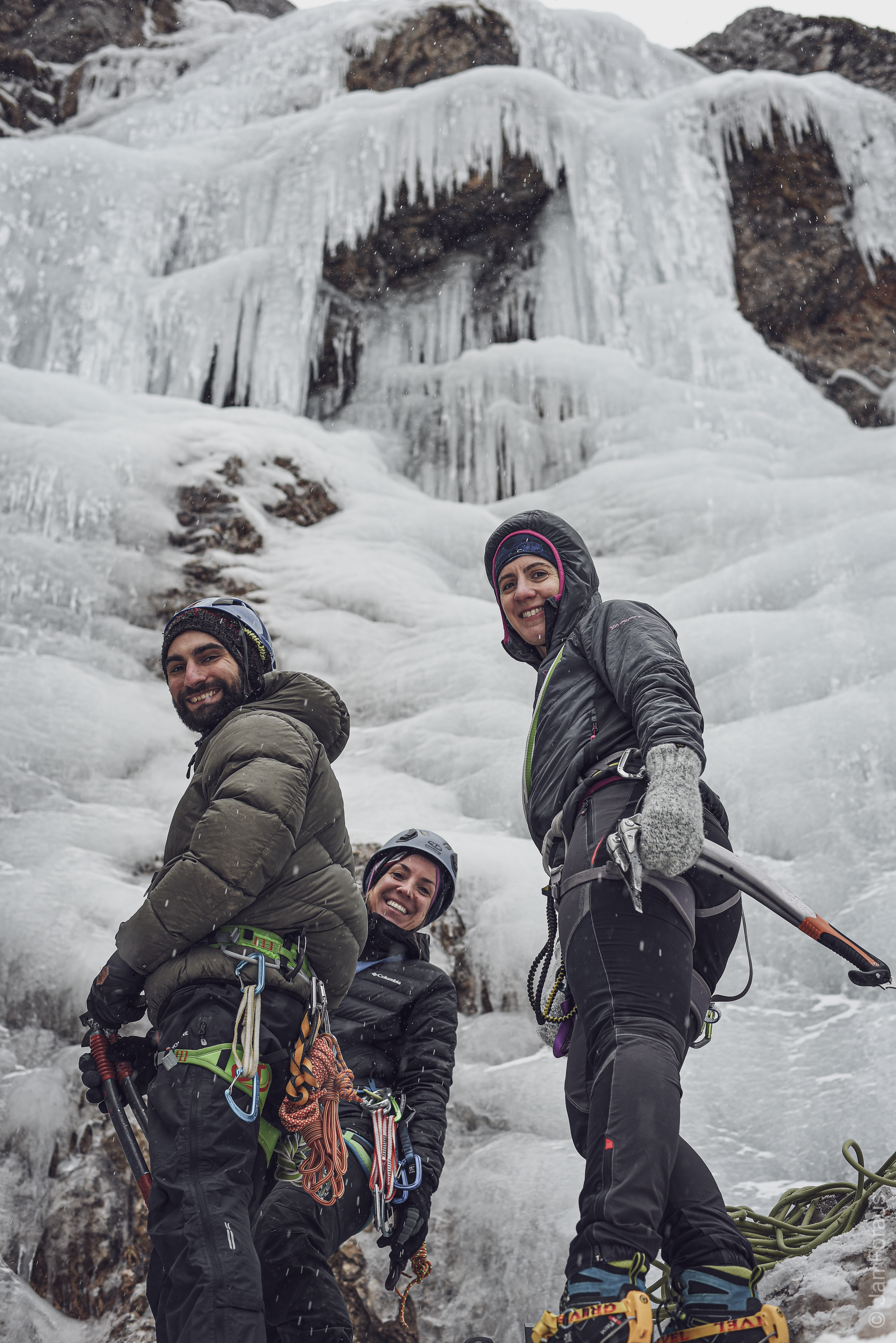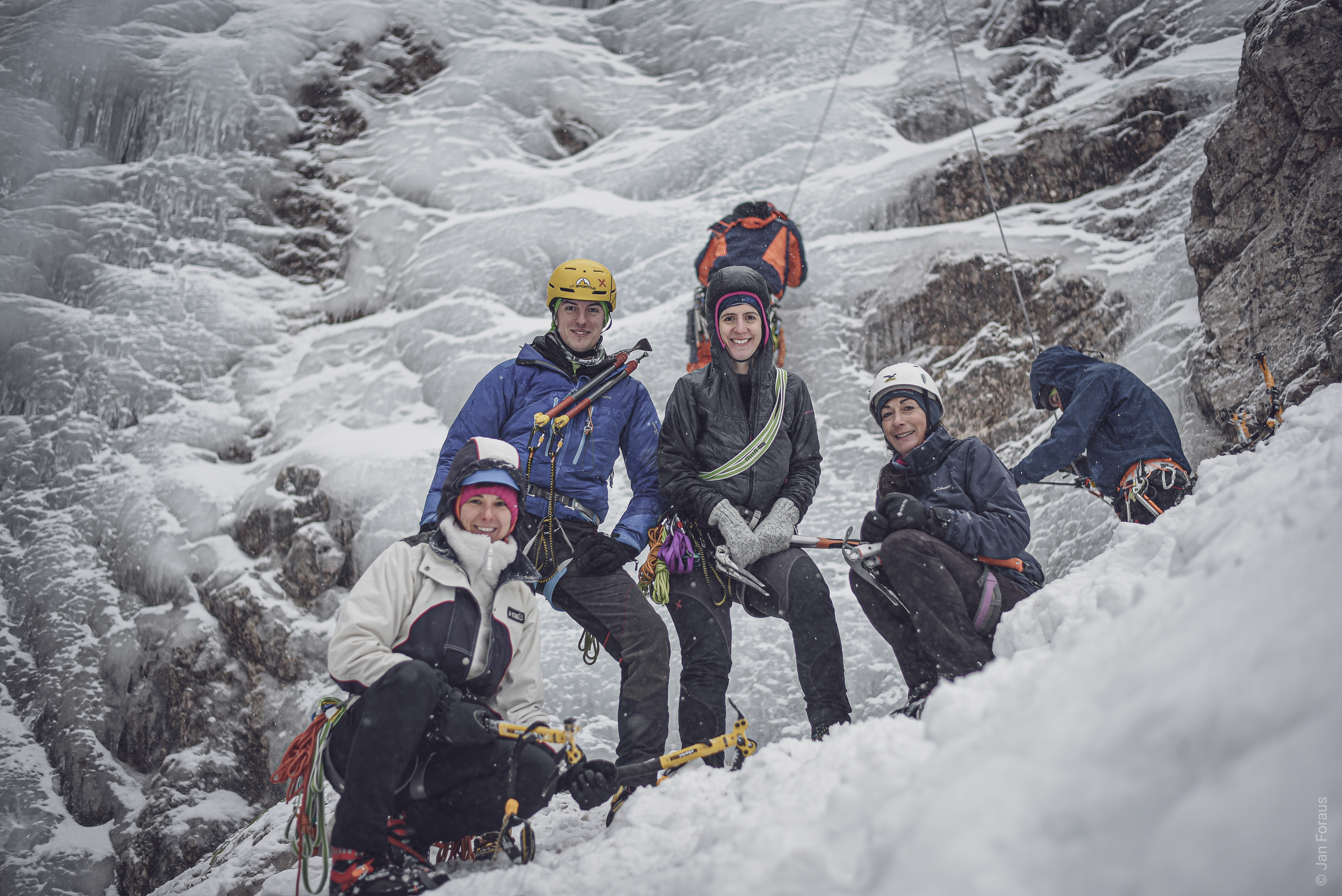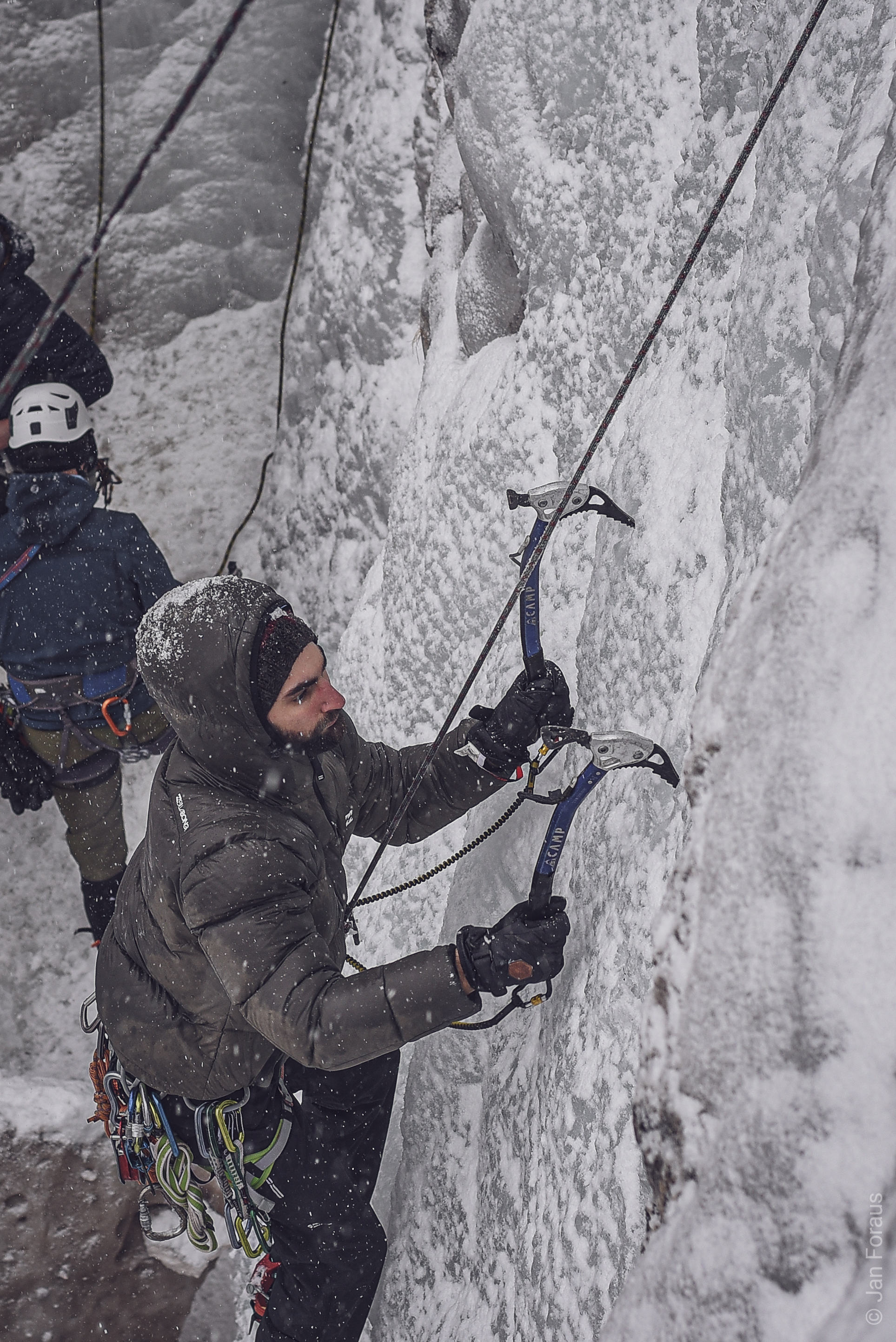 V soboto, 18.1.2020 smo izvedli tečaj v zaledenelih slapovih. Tokrat zdesetkana ekipa petih +1 tečajnikov (Thibaut, Matej, Anja, Maja, Meta, Anže), štirih pripravnikov (Jure, Ana, Jan, Jasmina,), ter Tone in Nejc, ki sta tečaj vodila, smo se odpravili na Jezersko in zajadrali pod Vikijevo svečo. Tam smo se udobno namestili in z Nejcem še enkrat predebatirali opremo za ledno plezanje ter način plezanja. Nato je besedo prevzel Tone in lotili smo se sidrišč v ledu. Najbolj fascinanten, je bil, kakopak, produkt sovjetskega uma izpred 90 let, sidrišče Abalakov in različne kombinacije povezav le tega v varno sidrišče. Nato smo se pod njunim nadzorom lotili same izdelave sidrišč. Nejc nam je pokazal tudi nameščanje vmesnih varovanj in gibanja med plezanjem, ko je napeljeval vrvi, ki smo jih kasneje uporabili za plezanje na top rope. Tone nam je prikazal izdelovanje sidrišč za spust po vrvi in po kolapsu v glavah, ki ga je povzročilo inženirsko zasnovano sidrišče za spust na ledenem vijaku, smo se te umetnosti lotili tudi sami. Za konec smo splezali še dve krajši liniji, ki nam jih je predhodno napeljal Nejc in se spoznavali s »talarji«, putrom in vsemi vrstami ledu, ki jih tokrat v spodnjem delu ponuja Vikijeva sveča. Tečaj smo s Tončkovo zaključno besedo in analizo sklenili pri Planšarskem jezeru v vedrem vzdušju.