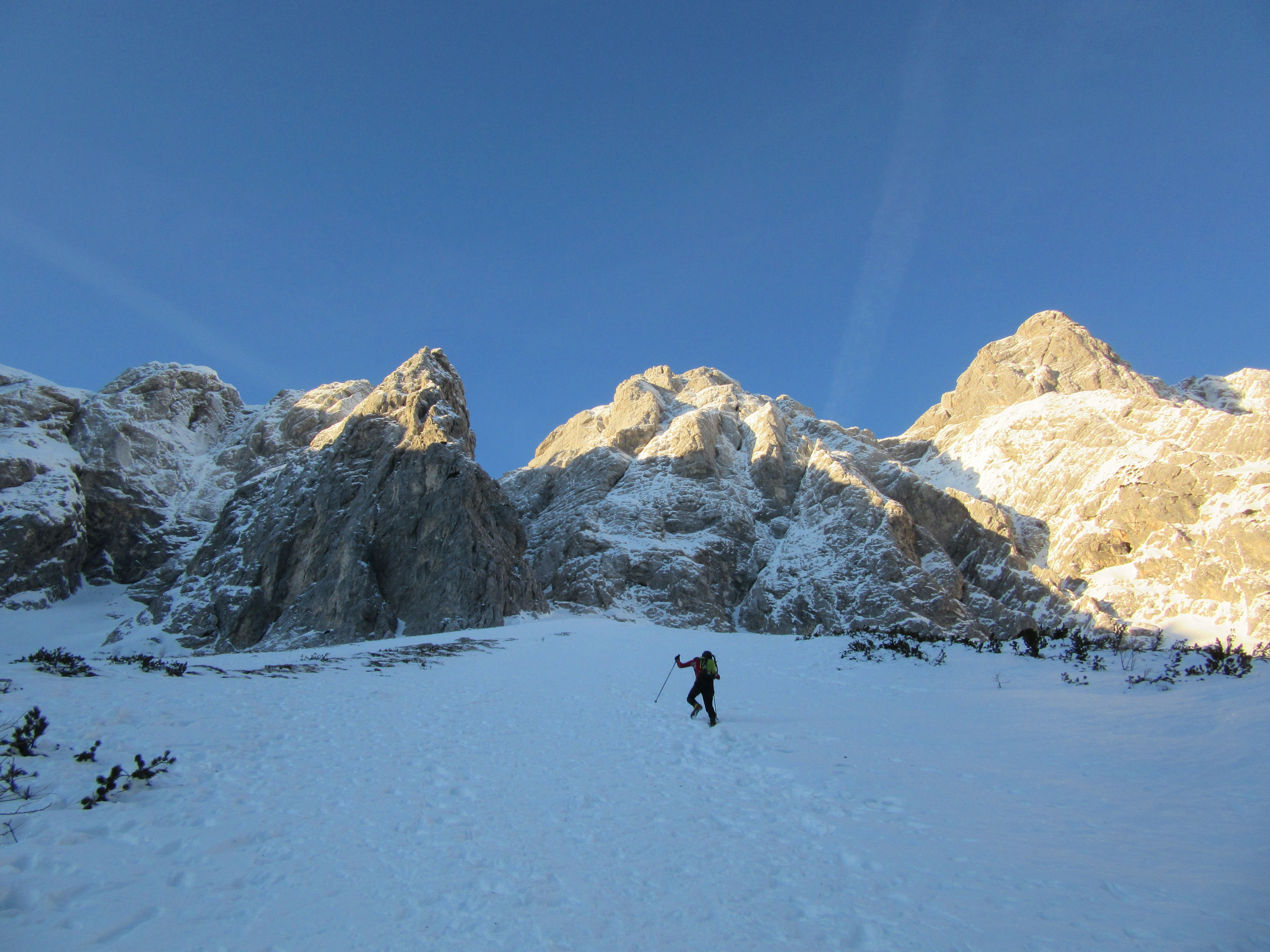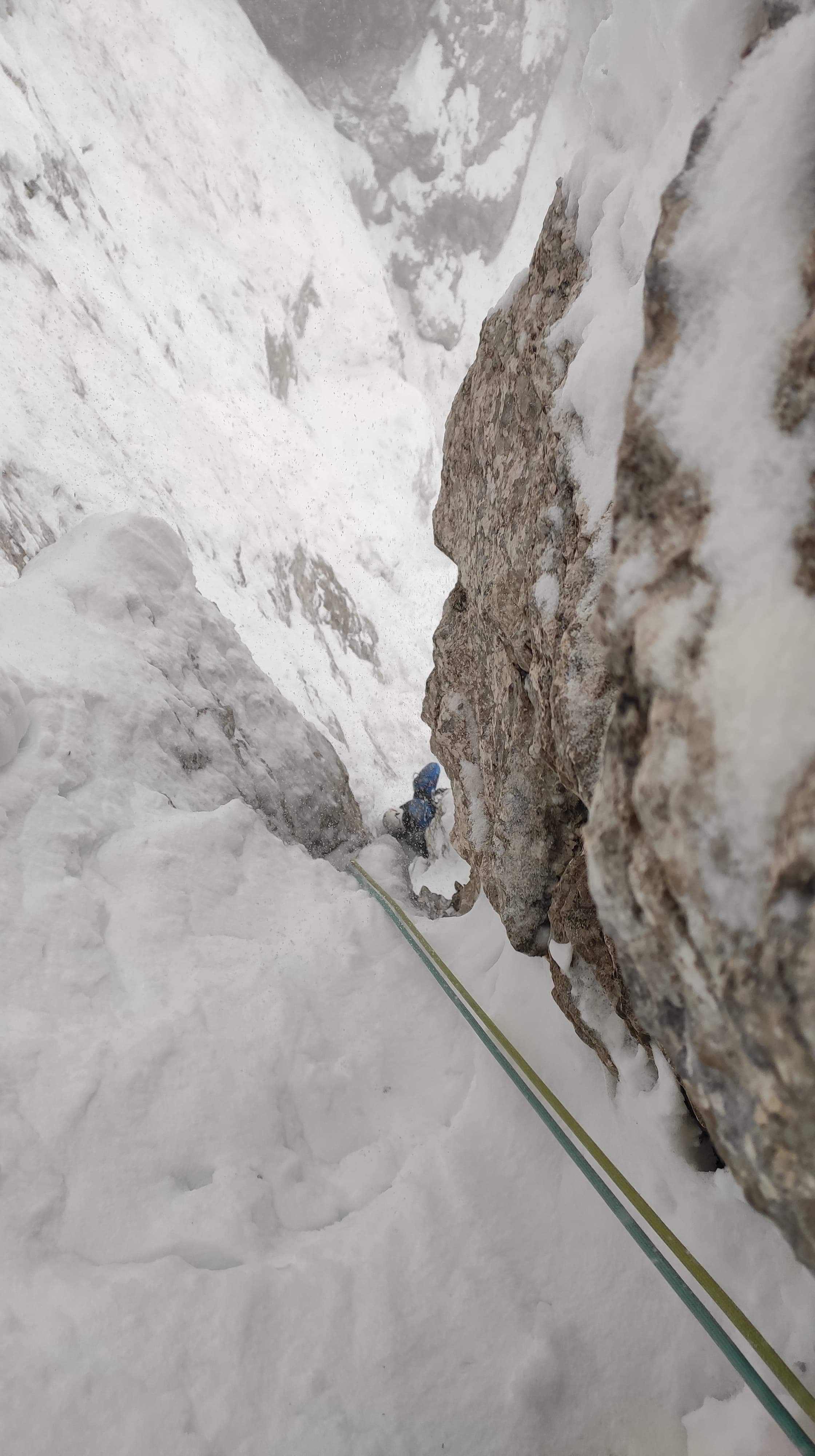 Z Rokom sva bila odločena, da greva za uvod v zimo na prvi decembrski dan nekaj splezat. Že poleti sem si zamislil splezat Košir-Brelih, pa sva takrat s soplezalcem zgrešila vstop in sva zarila v varianto Deržajeve. Ker tudi Rok še ni plezal te smeri, sva si rekla, »Ok, greva pogledat, bova že našla!«. Napoved je bila čudovito slaba. Vsaj do 11.00 naj ne bi snežilo, pa je nekako skoraj od začetka padalo po nama – če pa že ni snežil, pa so naju zalival pršni plazovi. In to čez glavo.