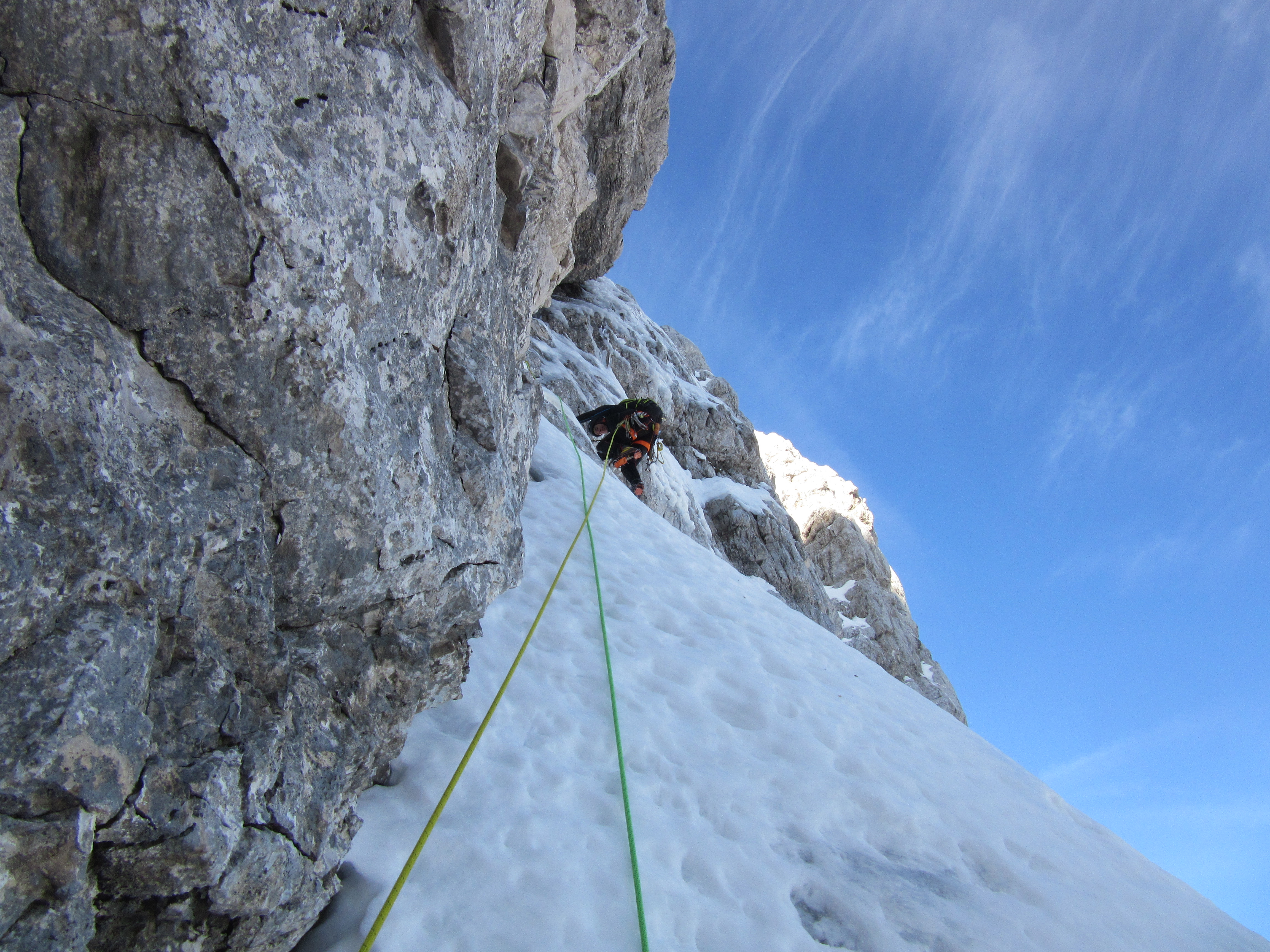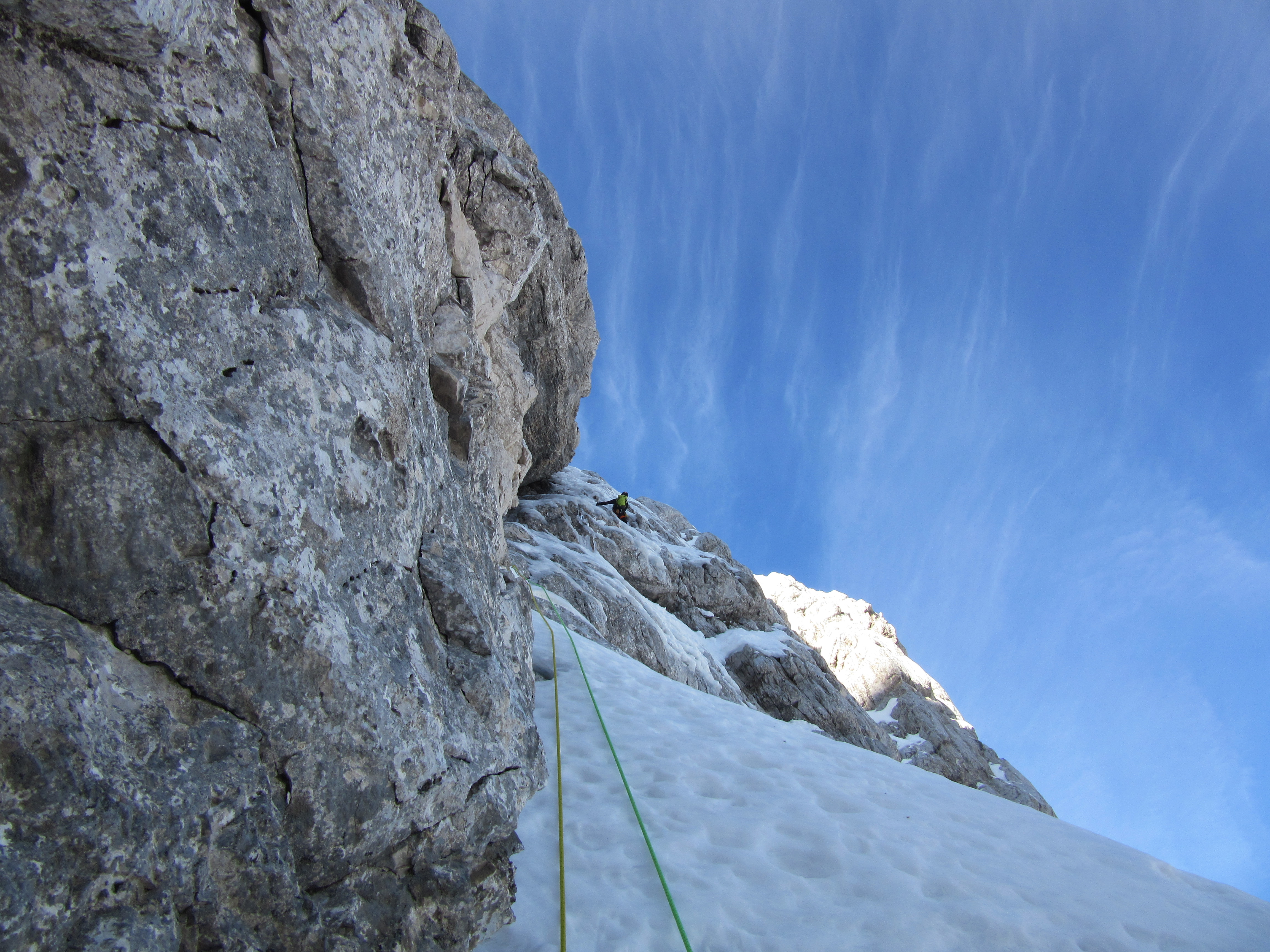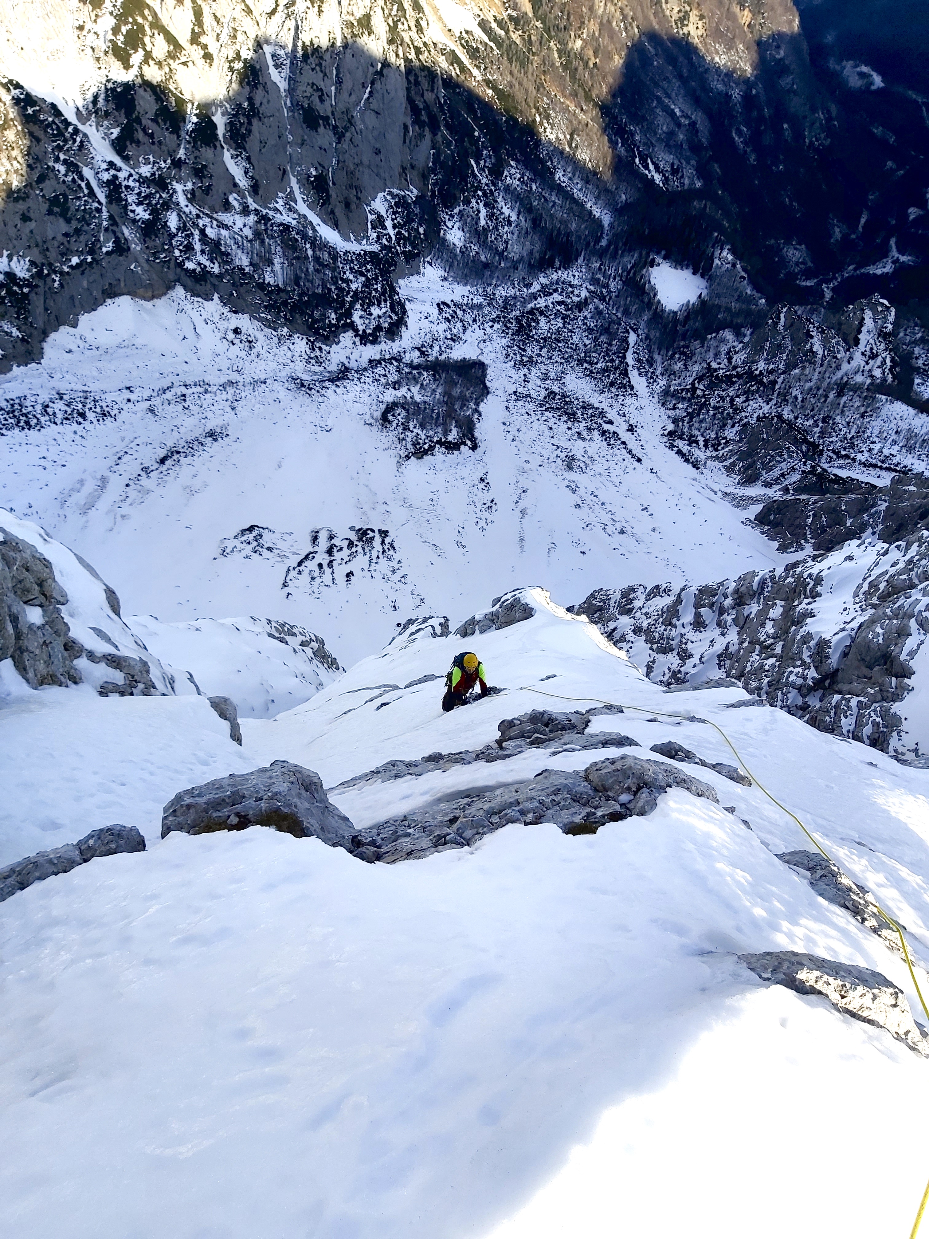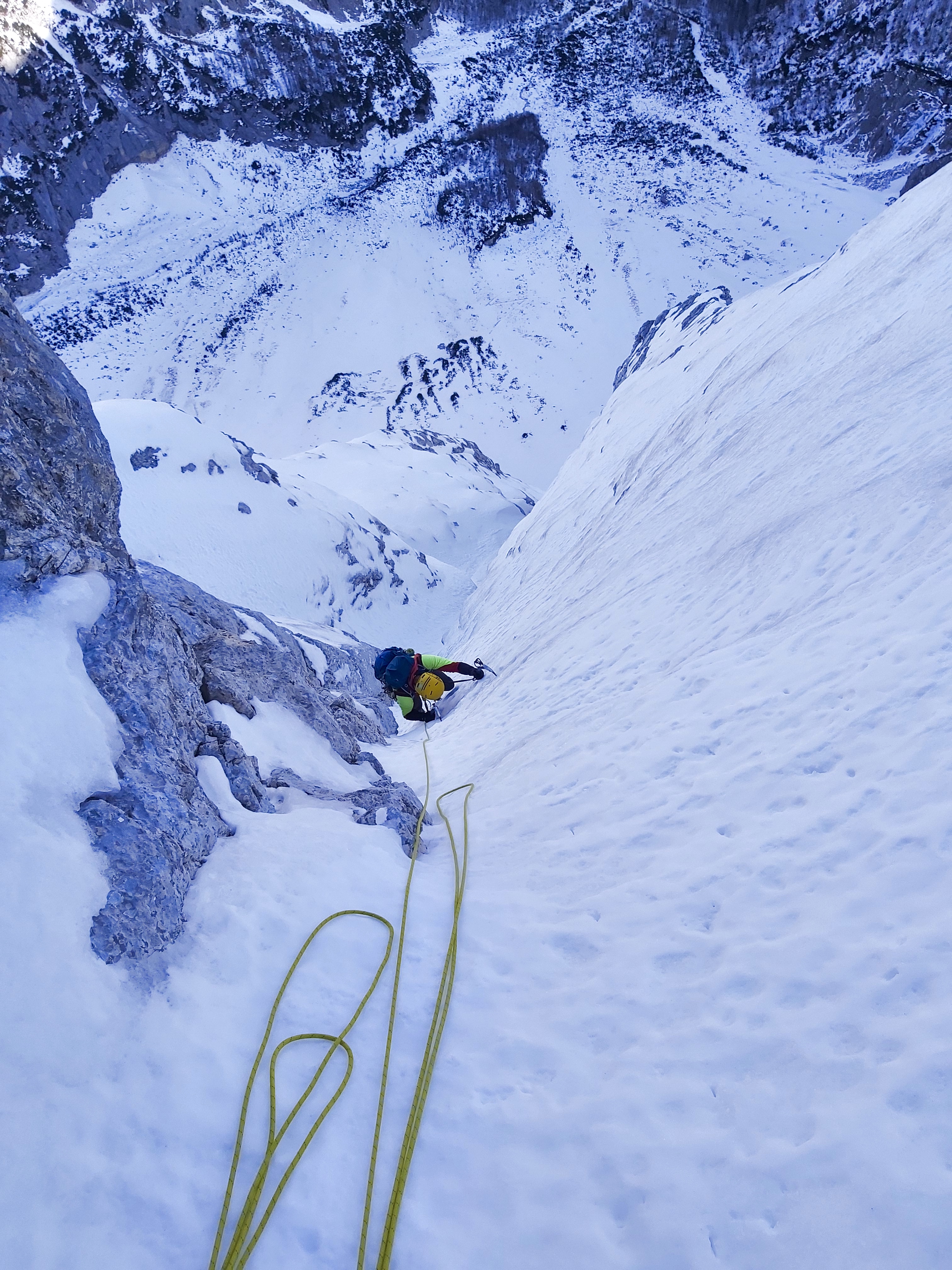 Nejc je celotno smer splezal v vodstvu in me, škorca, uvajal v užitke vibriranja cepinov.
