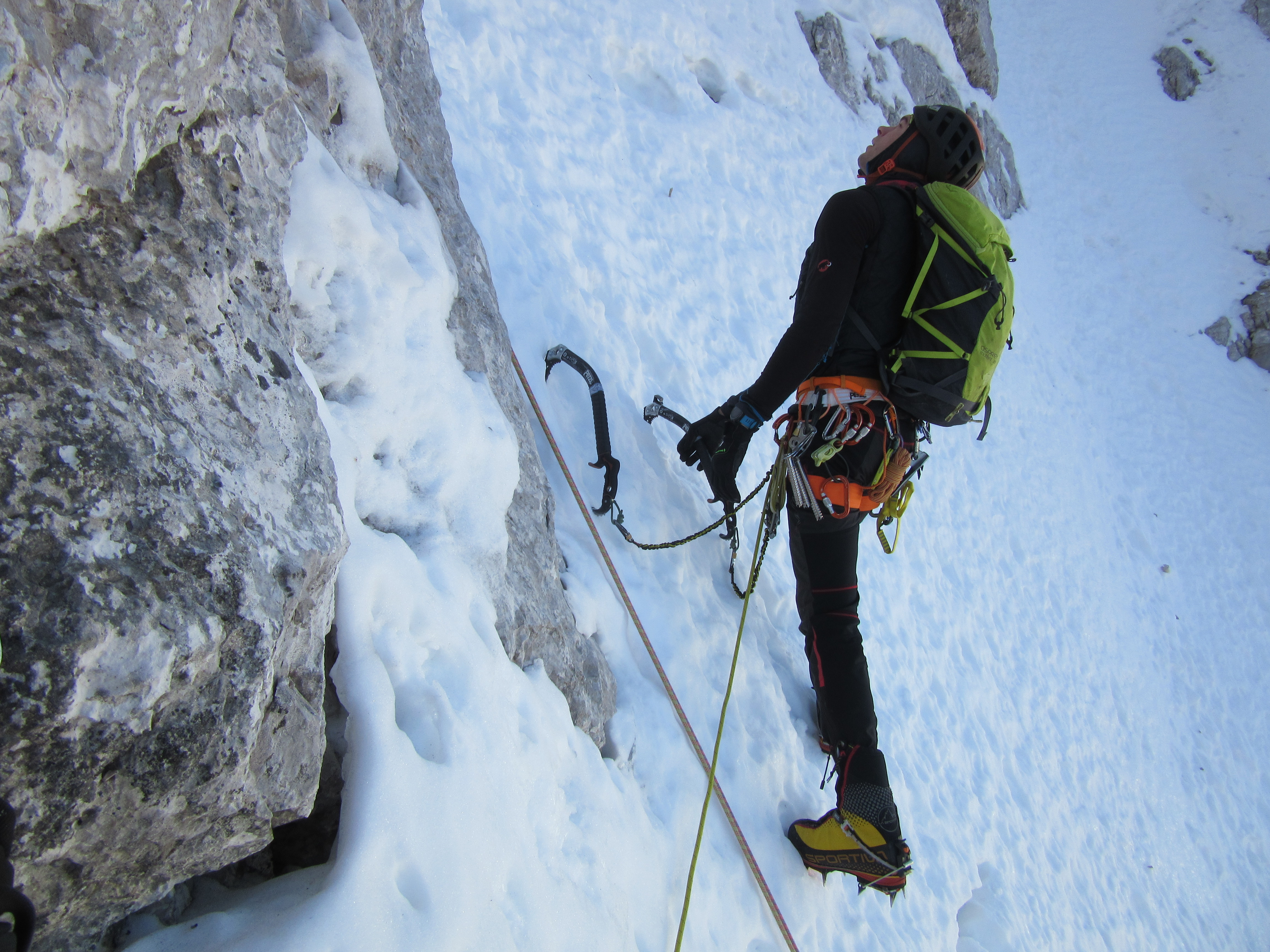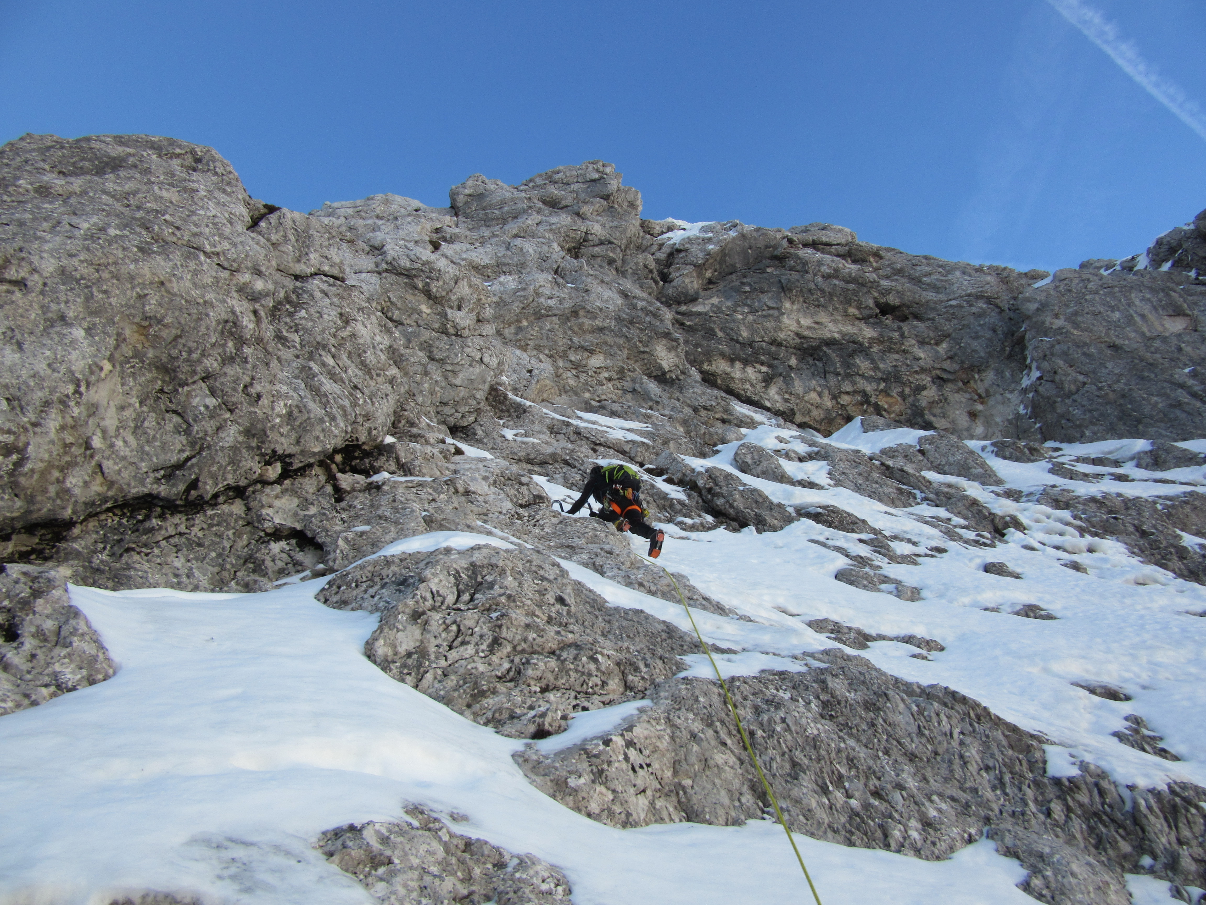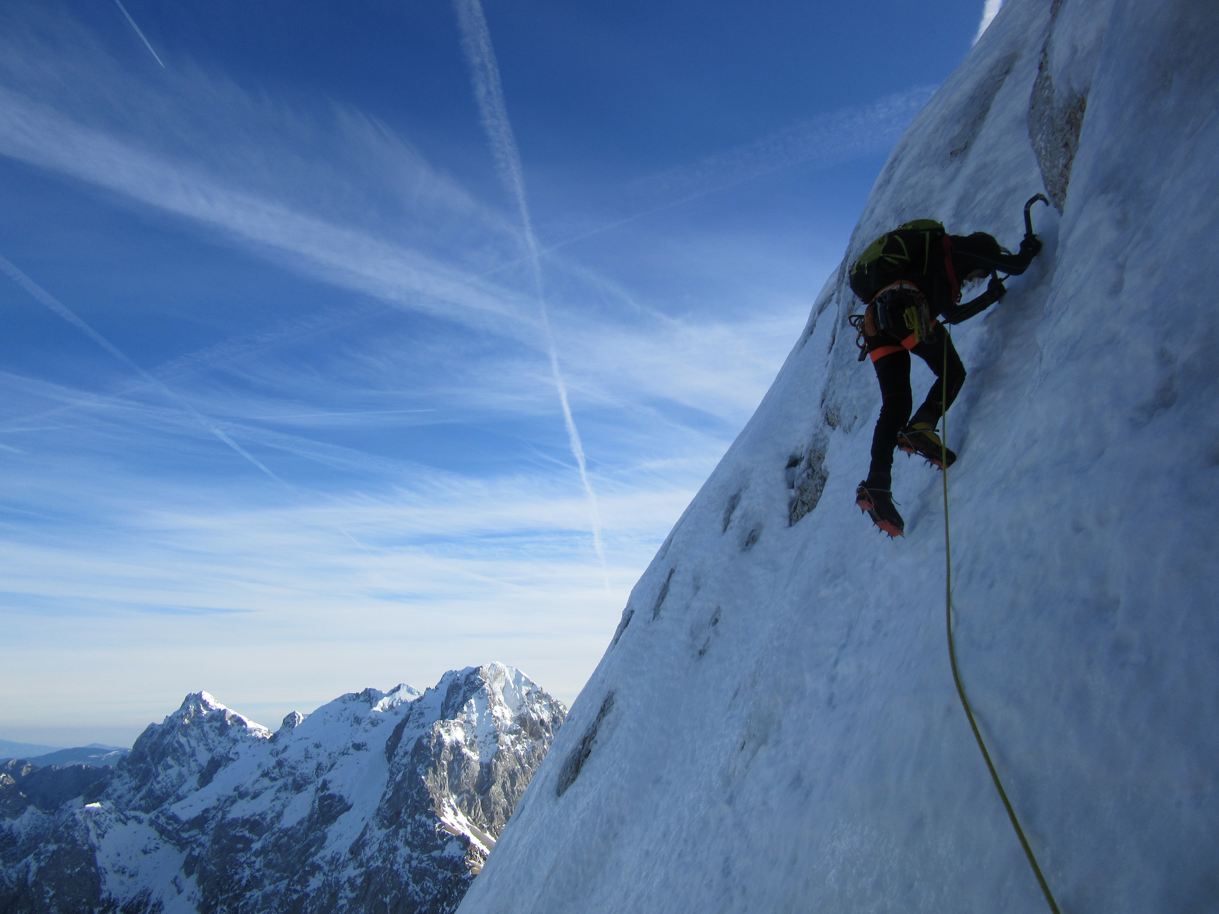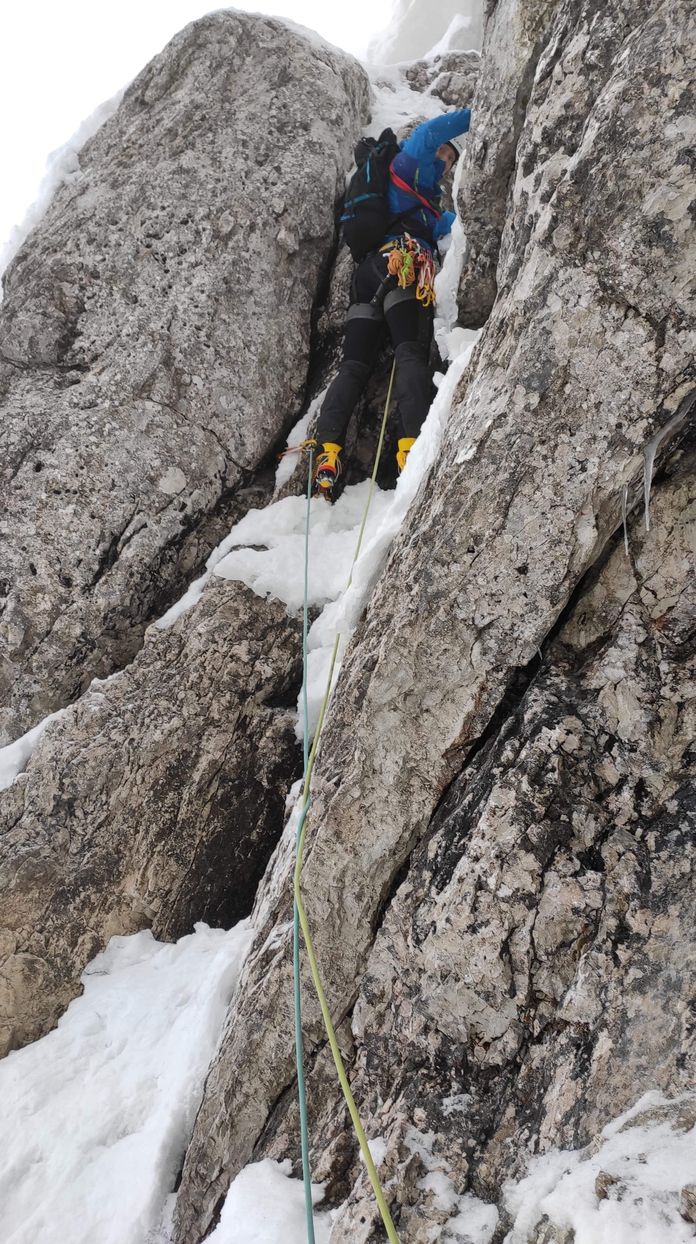 Nejc je celotno smer splezal v vodstvu in me, škorca, uvajal v užitke vibriranja cepinov.