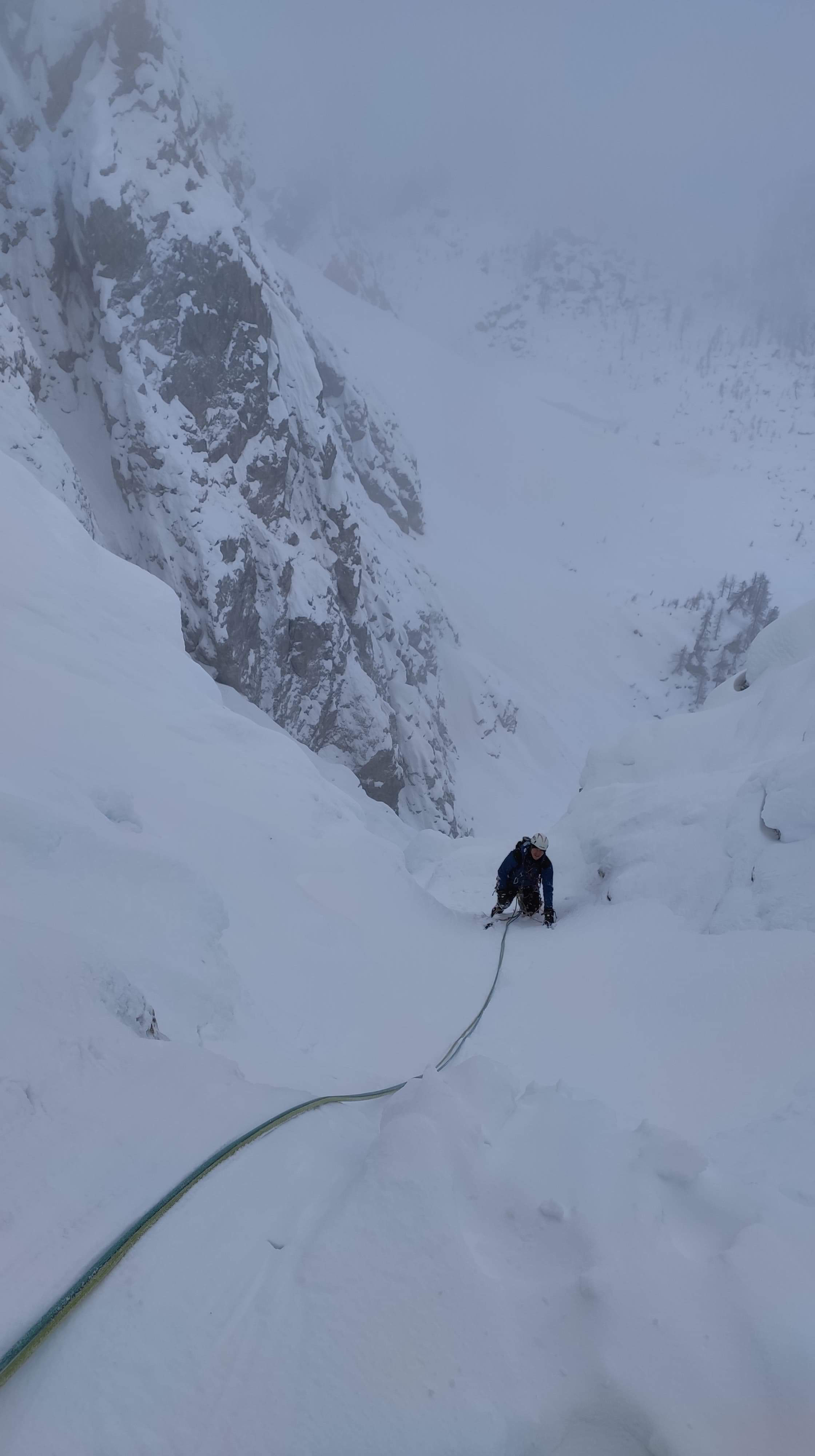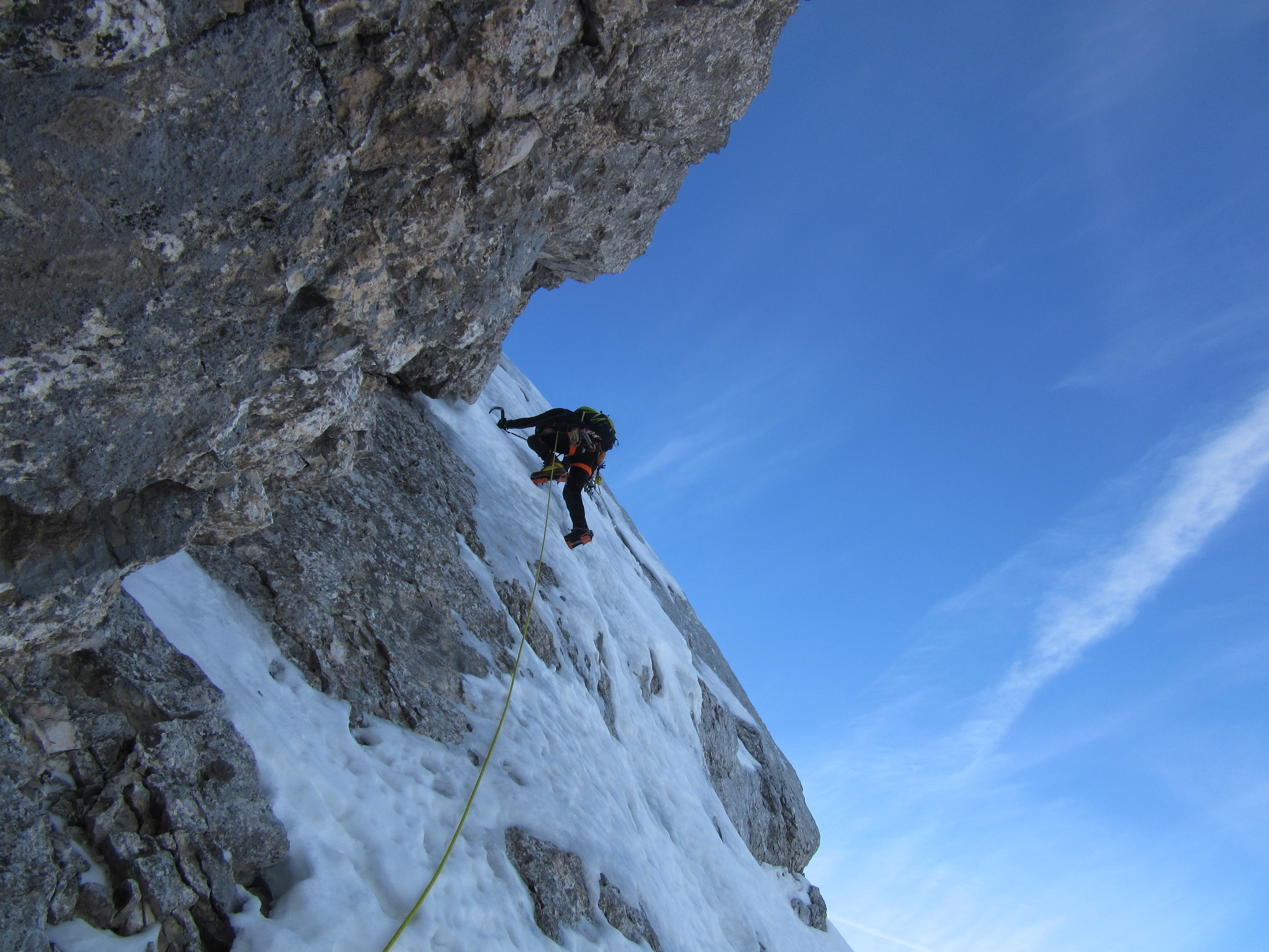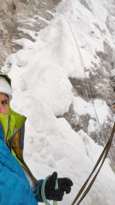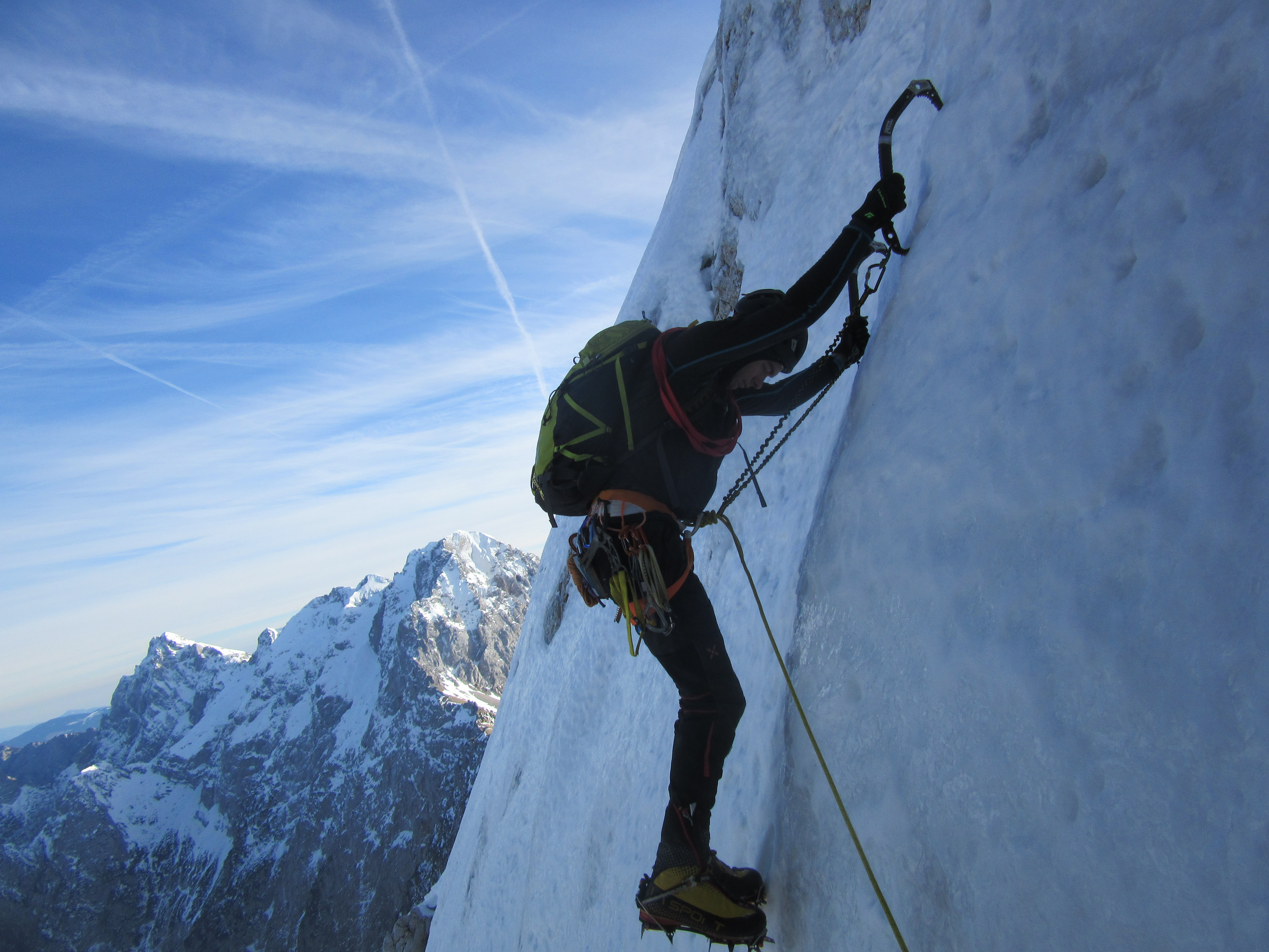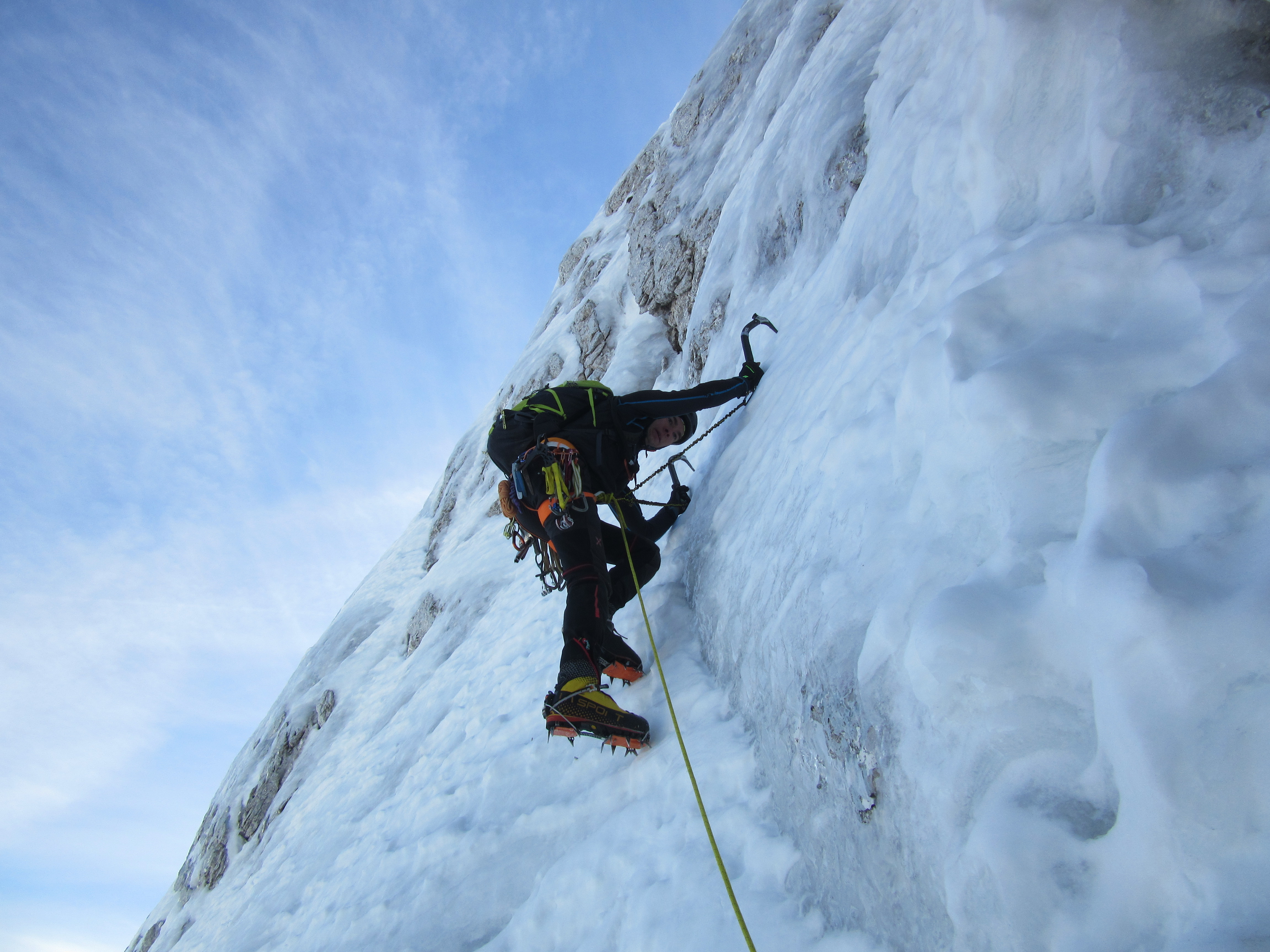 Nejc je celotno smer splezal v vodstvu in me, škorca, uvajal v užitke vibriranja cepinov.