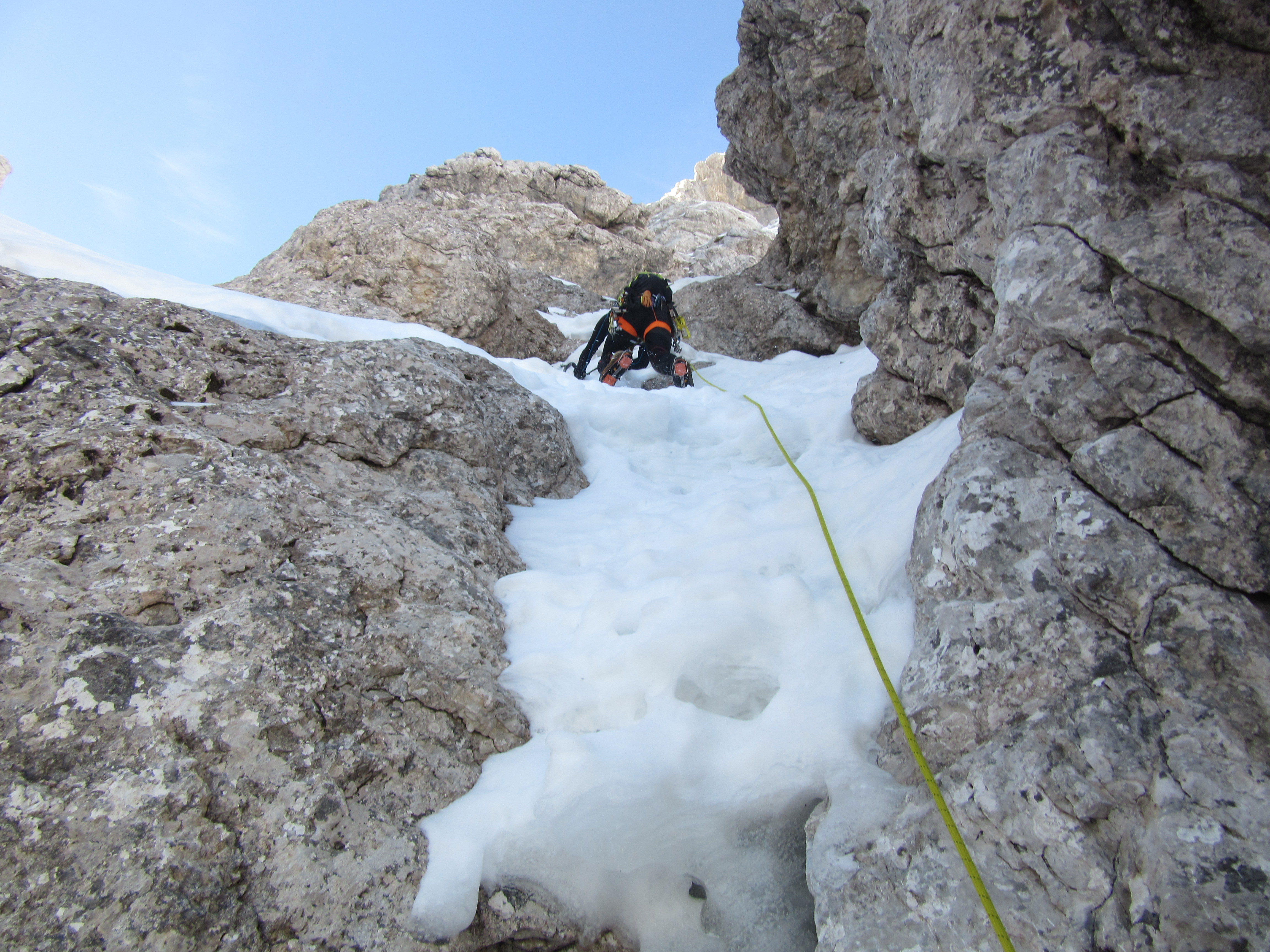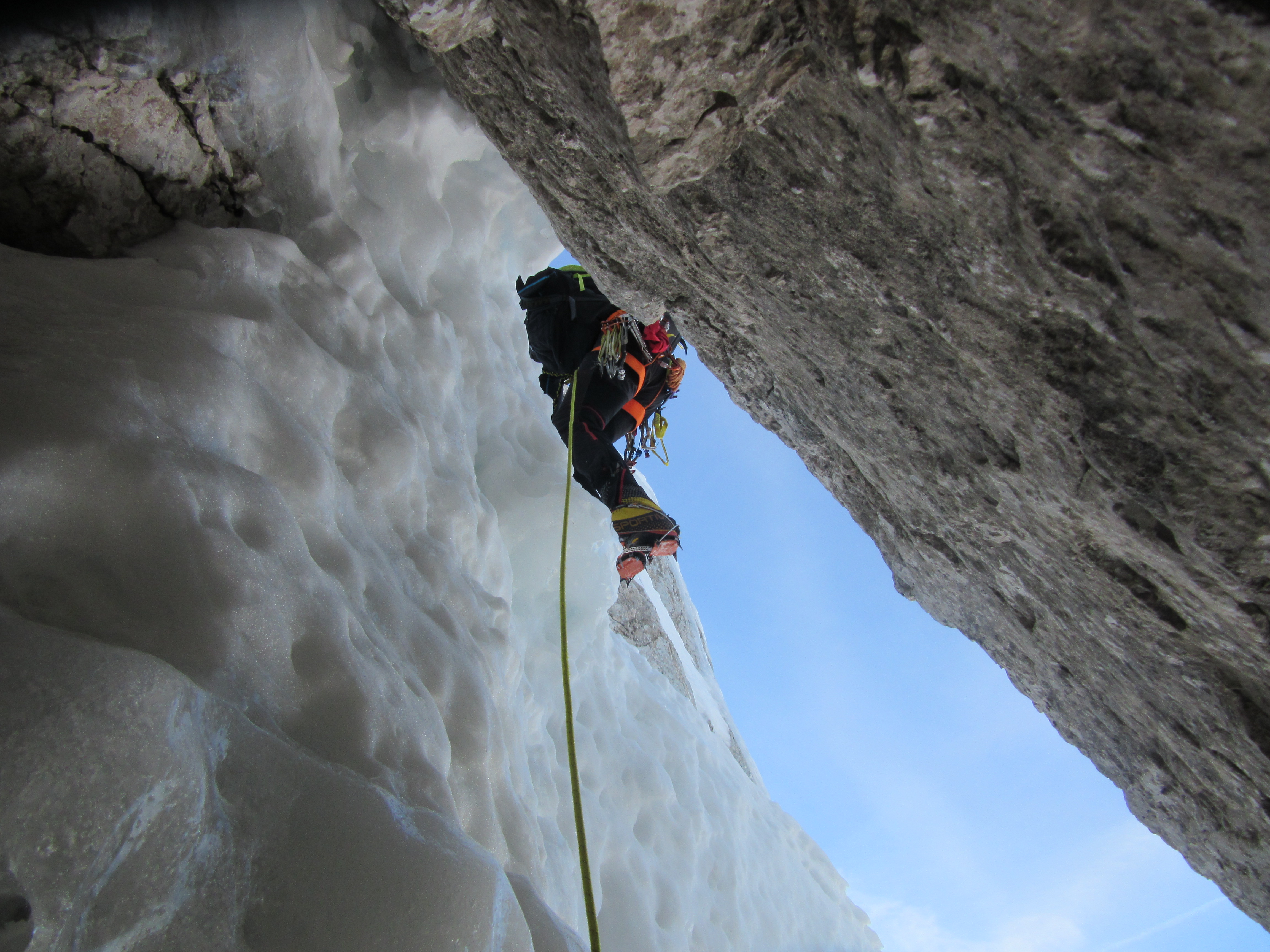 Že med dostopom sva »uočila« bolj direkten vstop od originala, kjer sta se že gužvali dve navezi. Nejc je našel lušten, zalit prehod in po dveh raztežajih sva bila v ustaljenih tirnicah. Sama smer je bomba, ker se o njej širi dober glas, tudi že precej razorana in naluknjana, temperature so bile človeku prijazne, razmere pa že klišejsko idilične, je fino zalita, zato skalo le dvakrat pohodiš. V zadnjih raztežajih sva si jo popestrila z levo izstopno varianto čez plate, ki so prav tako dobro zalite, začnejo se v ledu, nadaljujejo s škripanjem, končajo pa na vršnjem grebenčku, ki ga čez dan dobi sonce in je zato nekoliko bolj gnilo, a nič drastičnega. So pa poletni klini pokriti in je malo manj možnosti varovanja kot v spodnjih raztežajih. Morda še komu pride prav kak ledni klin, nama je.