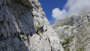 Zjutraj naju je res pozdravilo sonce in izbrana lepotica Diretissima je od daleč izgledala krasna. Samo od daleč, ker od blizu se je videlo da po njej teče potok. No, fino, lepa reč. Pa sva spet modrovala in šla na izlet po Posočju, si ogledala krasno Loško steno in steno Jerebice in se vrnila spat na izhodišče za drugi poskus izbrane smeri. Ker me spanček zjutraj zelo, zelo (ampak res zelo) težko spusti iz rok, sva malo podremala in bila tretja v vrsti za smer. Pa sva se spomnila tiste napovedi, da bo za kosilo dež in izbrala smer brez vlakca, Desno diretissimo. Z Miheličem se strinjava, da je lepa in vredna obiska.