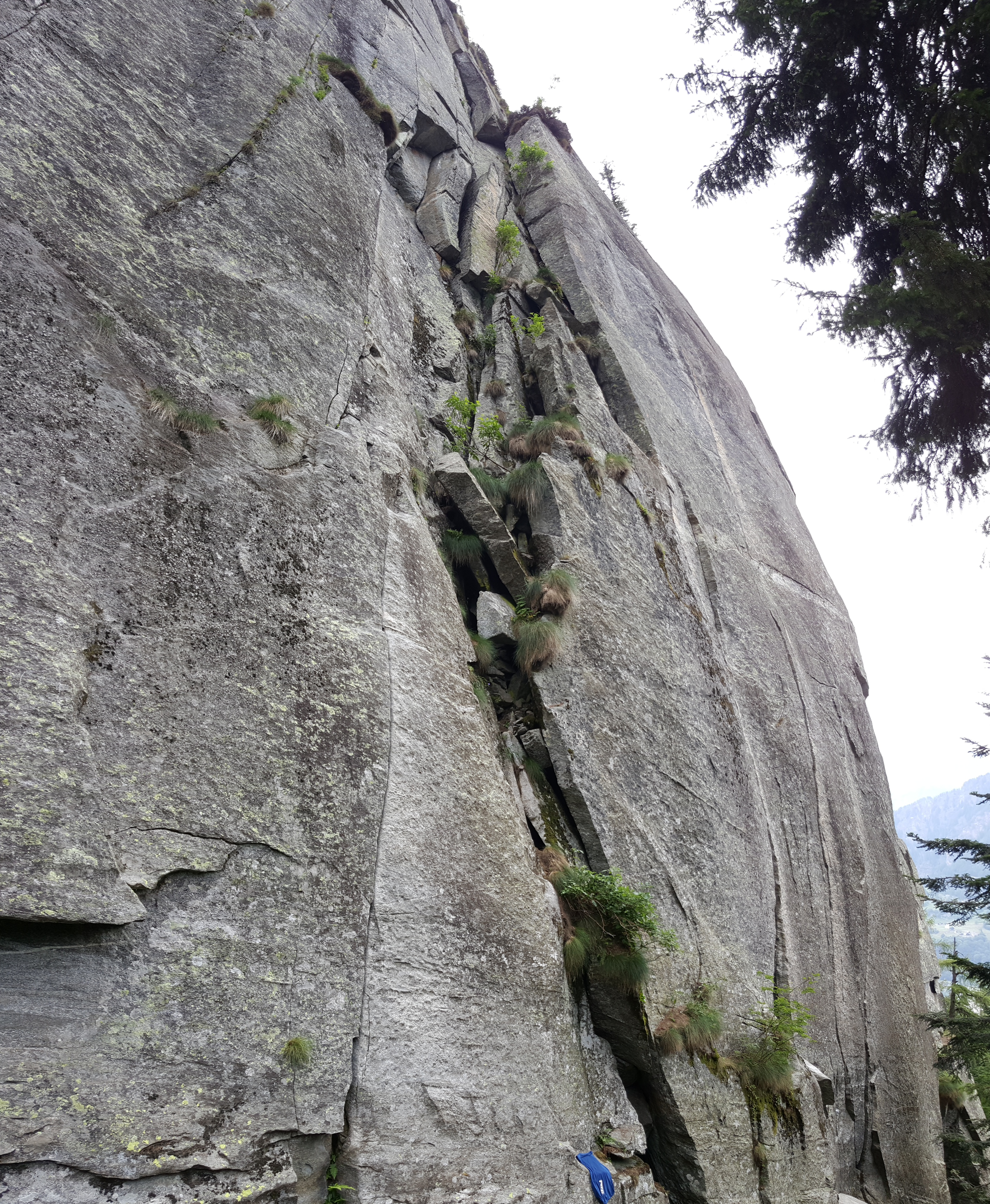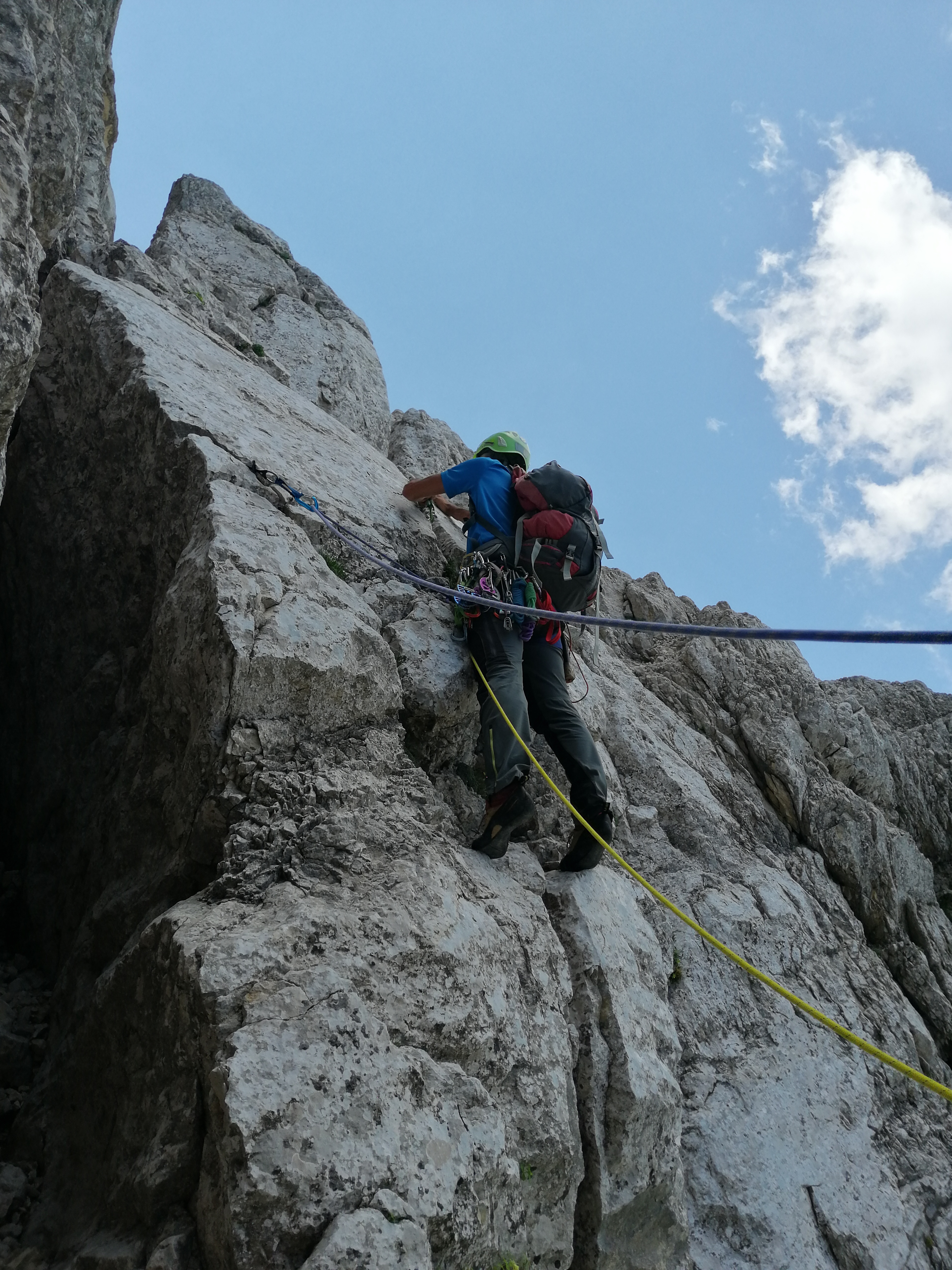 Izbrala sva smer Palouz-Tschada, 1000m. Smer skozi celo steno išče dobre prehode in orientacija ni težka. Ker nisva vedela kaj pričakovati, sva se opremila še z opremo za bivakiranje.