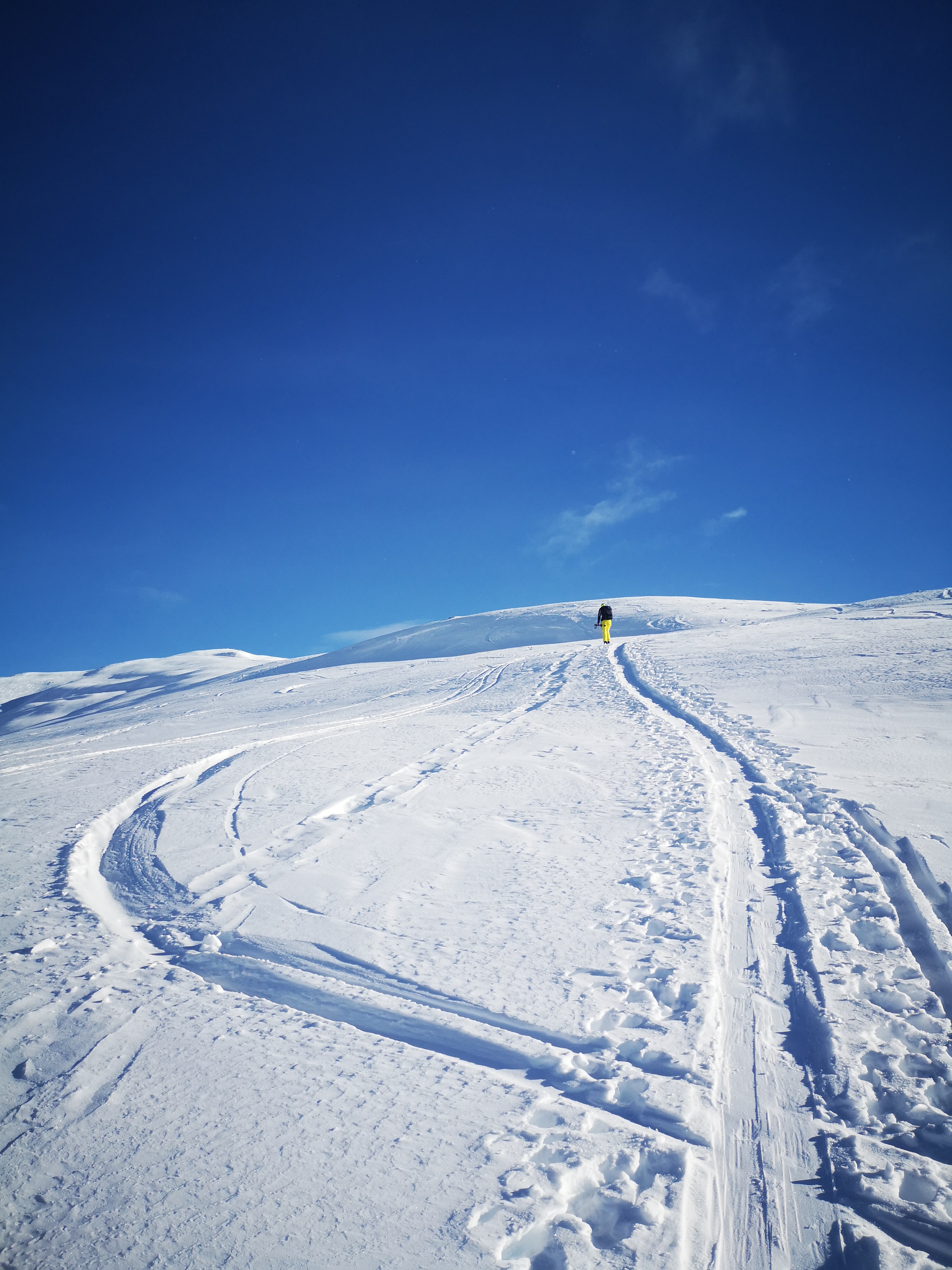 Kljub kar visoki temperaturi je bil sneg zelo ugoden. Hitro smo pripravili smuči in se spustili po strmini. Prvi del spusta je bil odličen, pršič in še nezvoženo pobočje. Tudi drugi del spusta skozi gozd, je bil uživaški, le na nekaj senčnih odsekih je bilo malo poledenele skorje. Ker je spust prehitro minil, smo se odločili, da gremo še enkrat. Povzpeli smo do polovice in znova uživali na vijuganju med drevesi.