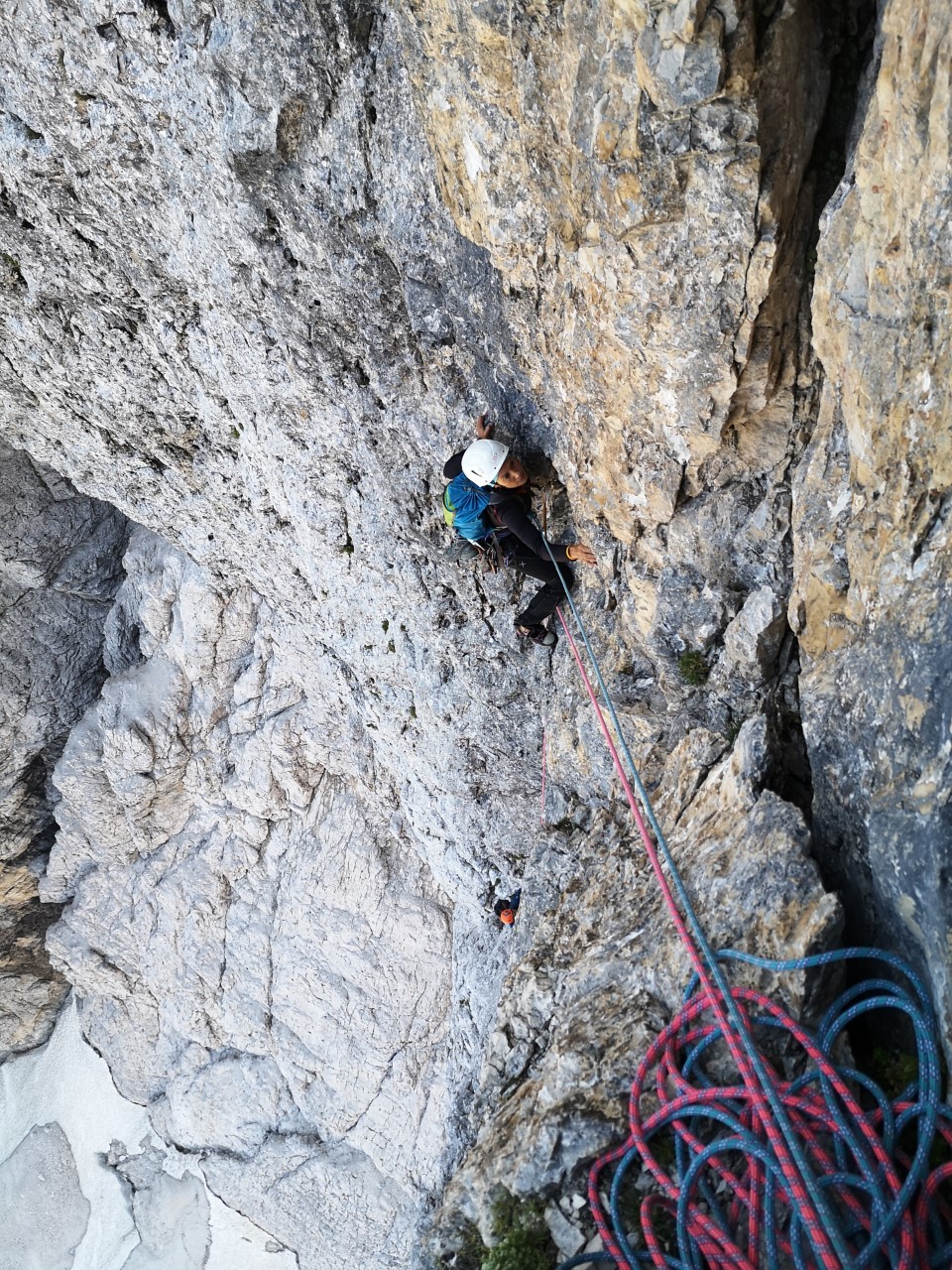 V soboto sva se s po-dopustniškim Gregorjem namenila splezat kaj lepega v dolini Mrzlih vod. Izbral sem Piussijevo smer v Pinnacolu, ki jo Mihelič postavlja ob bok slavnejši sosedi, missici Julijcev v Trbiški Krniški špici. Na melišču pod steno pa, glej ti to, srečava še dve Vertikalki, Ano in Heleno. Ker so Heleno dajali krči in se je odločila za povratek v dolino, sva privezala Ano na en konec štrika (nema kod nas hoču-neču) in tako smo bili do konca dneva trije.
